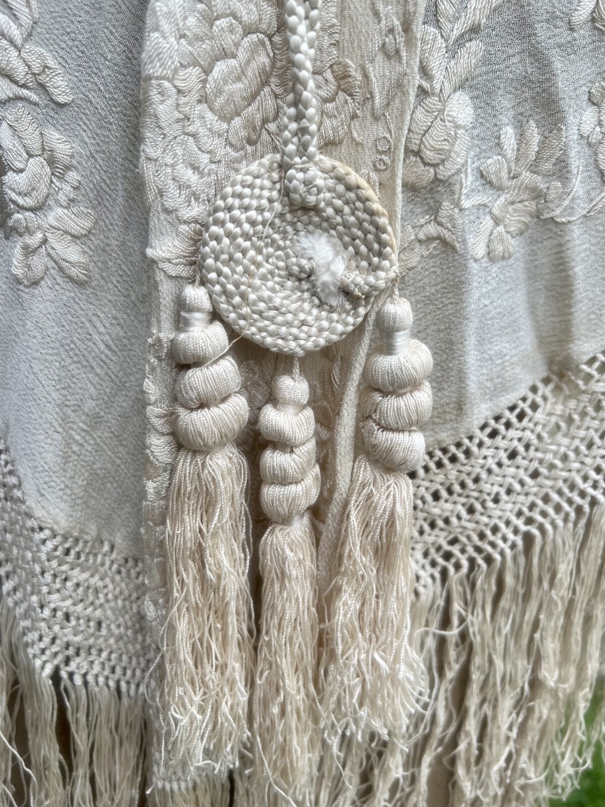 как выглядит ANTIQUE VICTORIAN CREAM EMBROIDERED PIANO SHAWL CAPE TASSELS MUSEUM PIECE фото