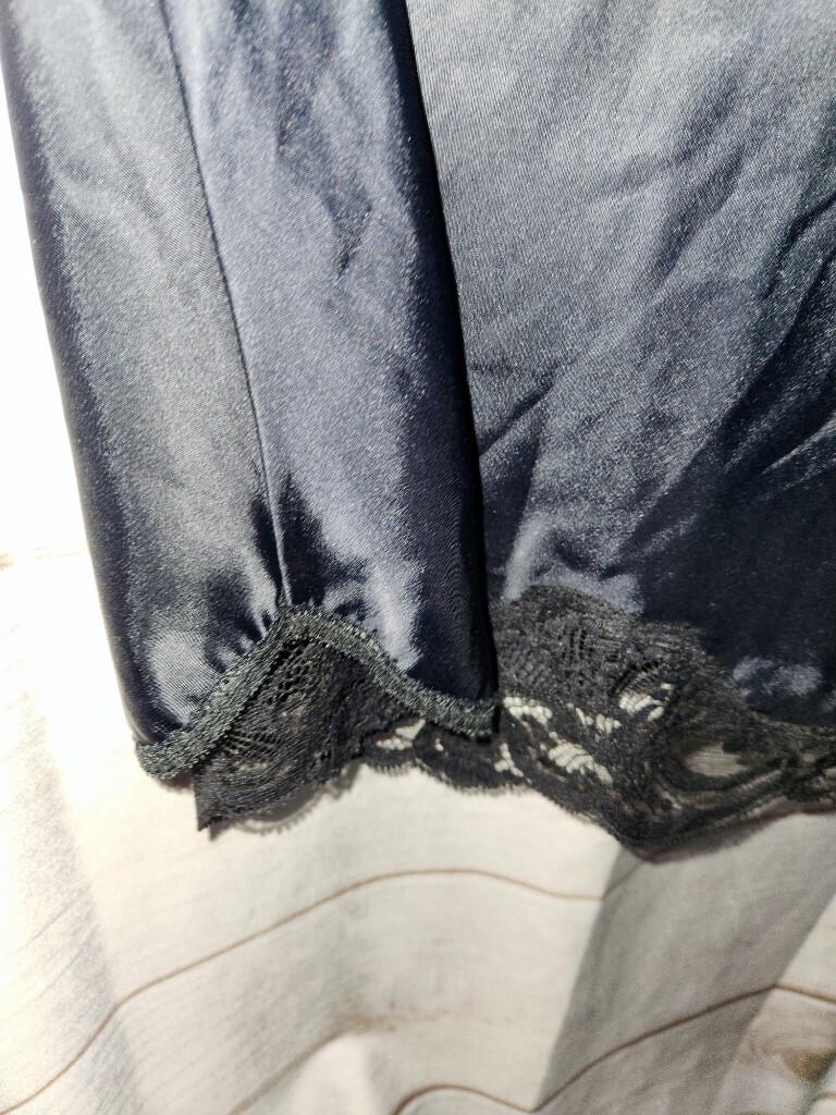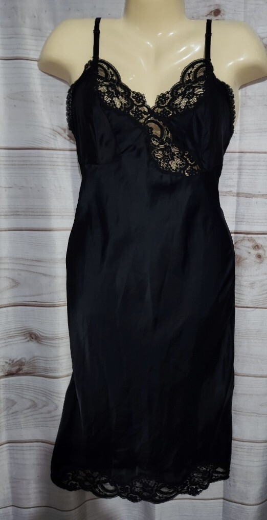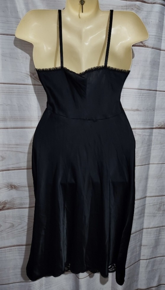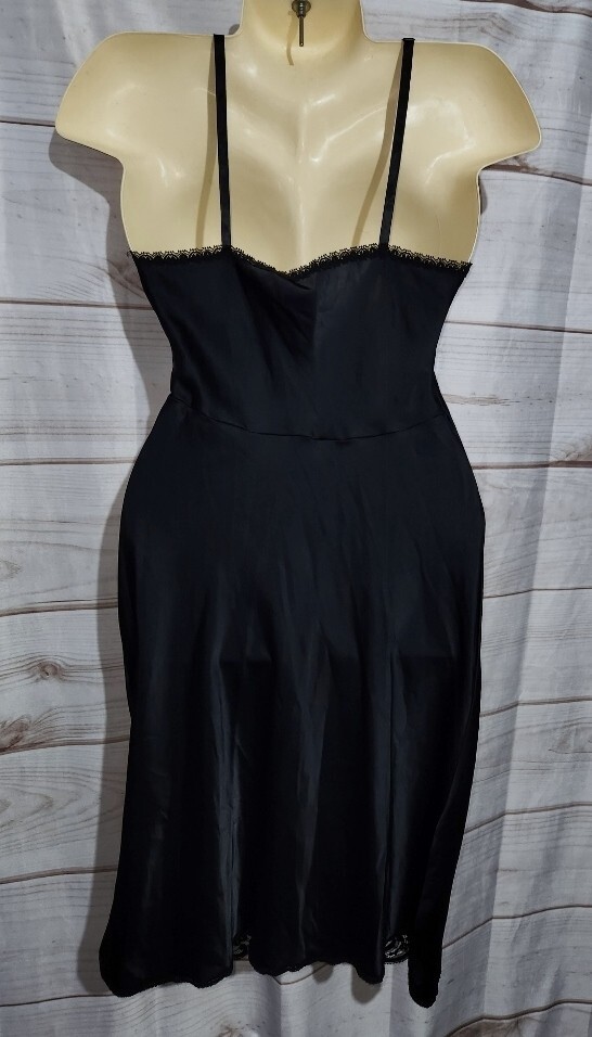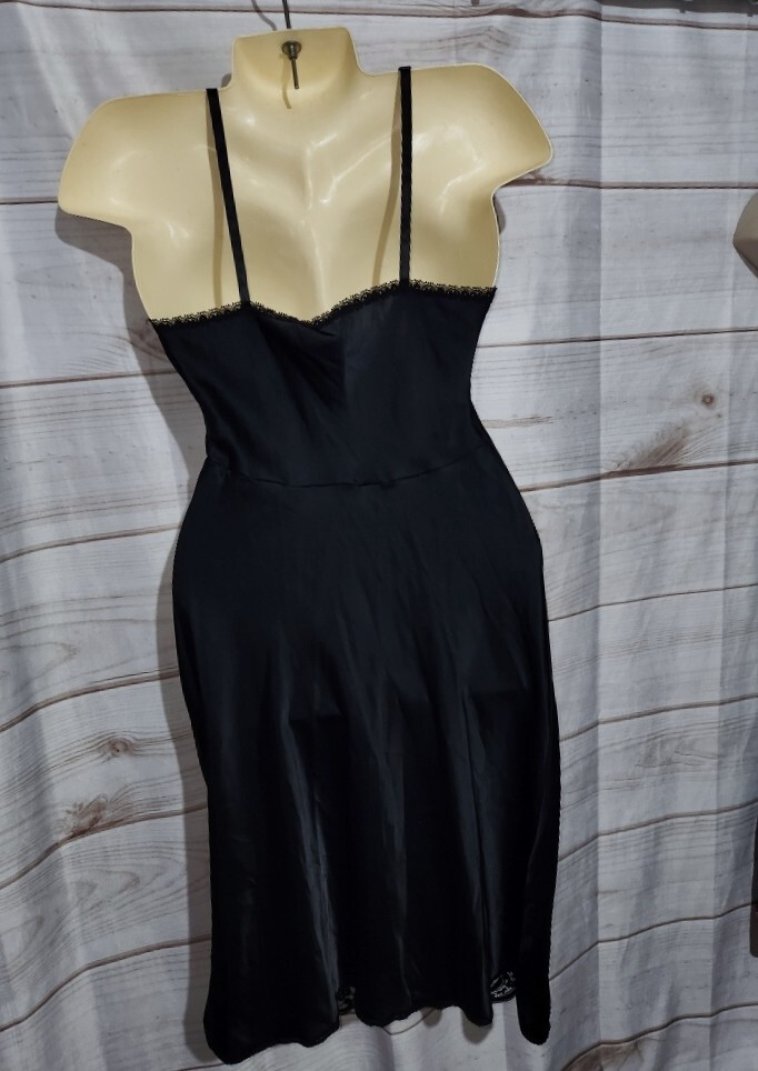 как выглядит VTG Wonder Maid 32 Black Satin Full Slip Dress Lace Trim Nylon 2431 Non Cling фото