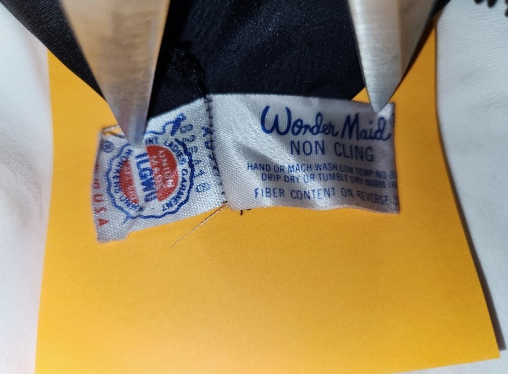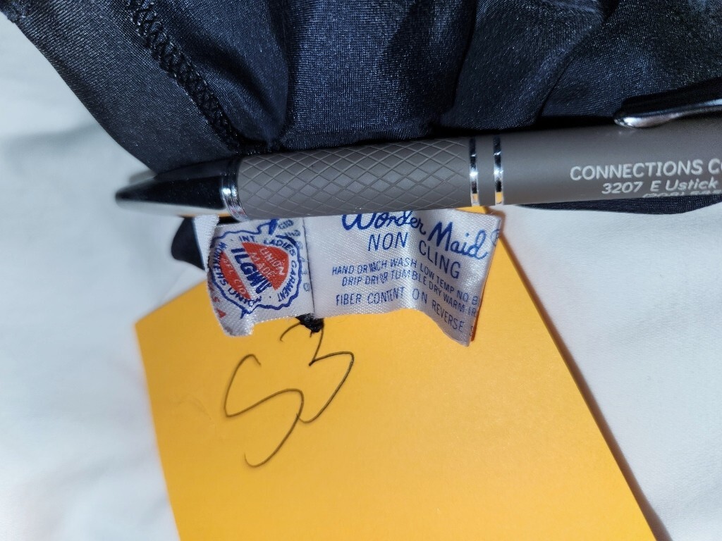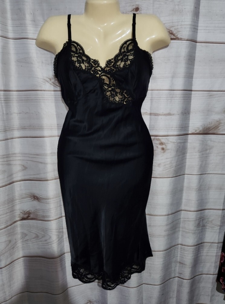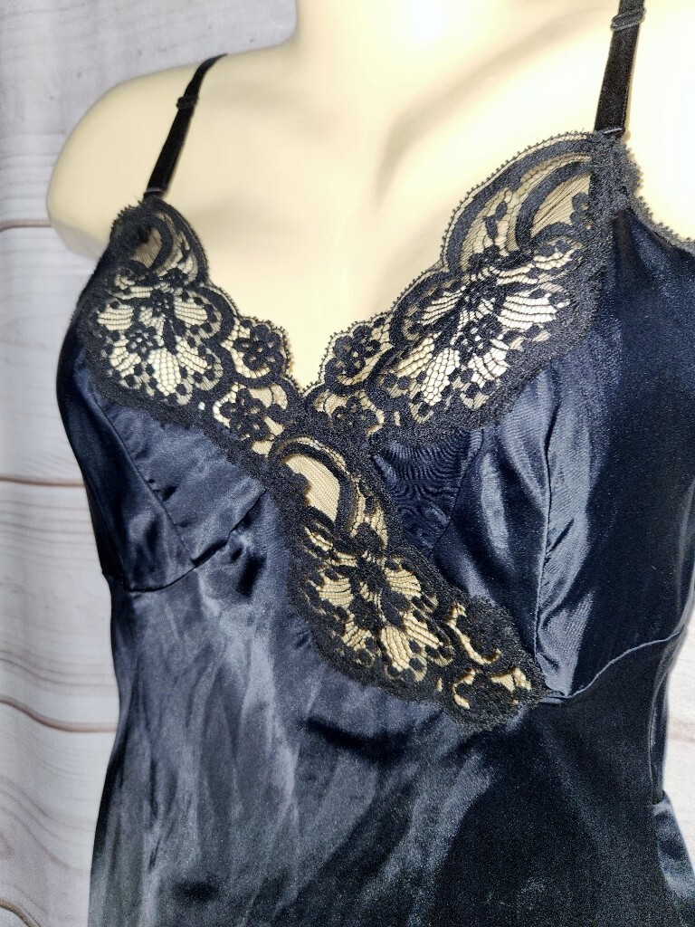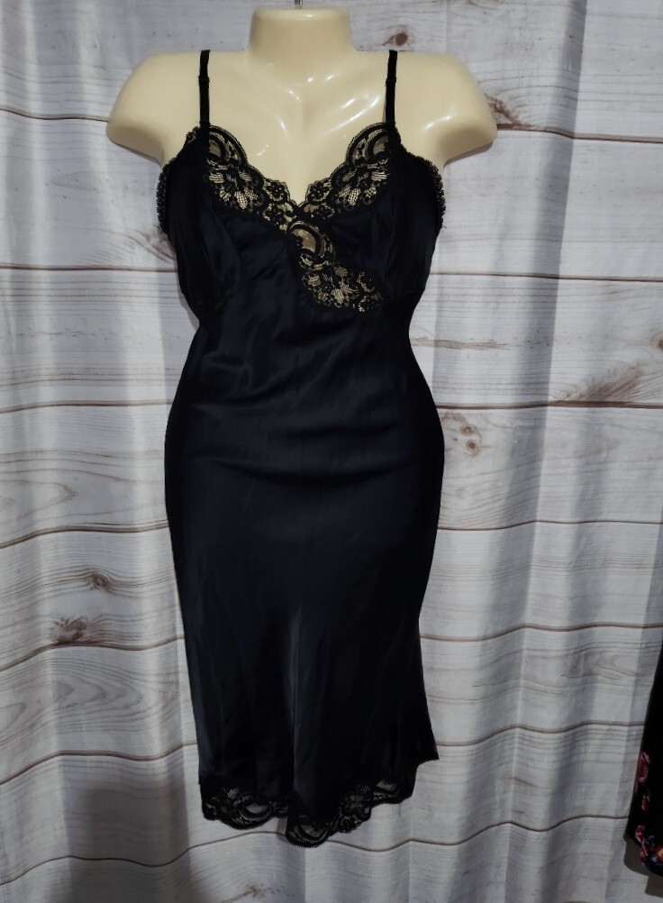 как выглядит VTG Wonder Maid 32 Black Satin Full Slip Dress Lace Trim Nylon 2431 Non Cling фото