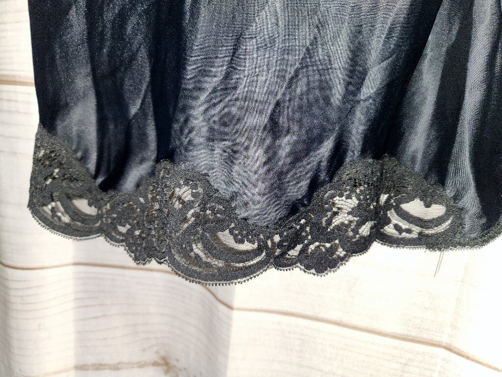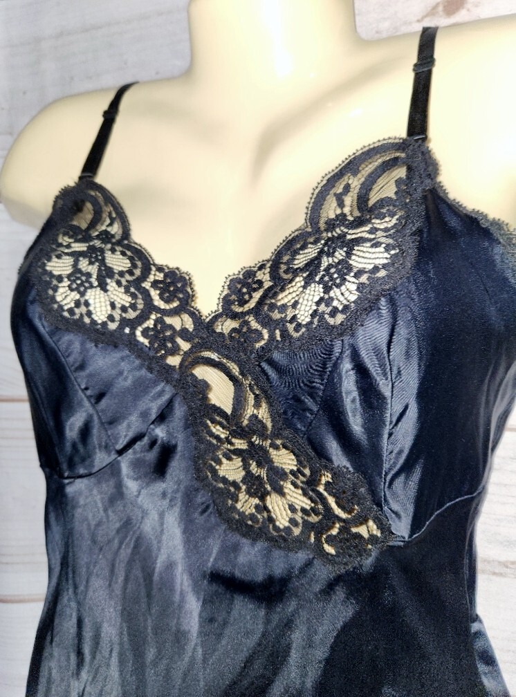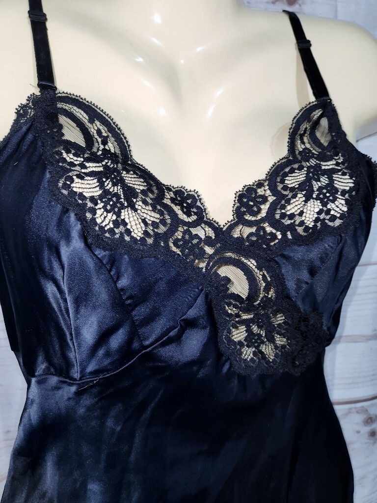 VTG Wonder Maid 32 Black Satin Full Slip Dress Lace Trim Nylon 2431 Non Cling