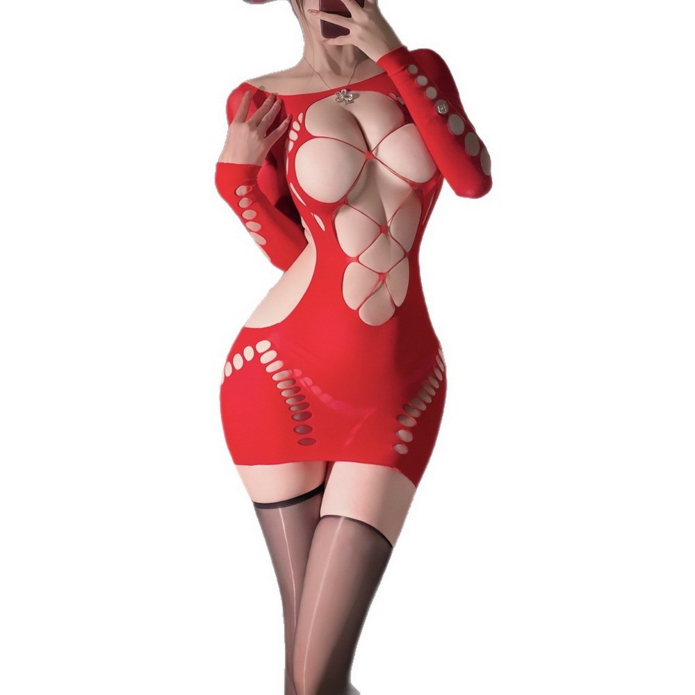 Women Fishnet Body Stockings Short wrap dress Long sleeve 2pcs Underwear 26021