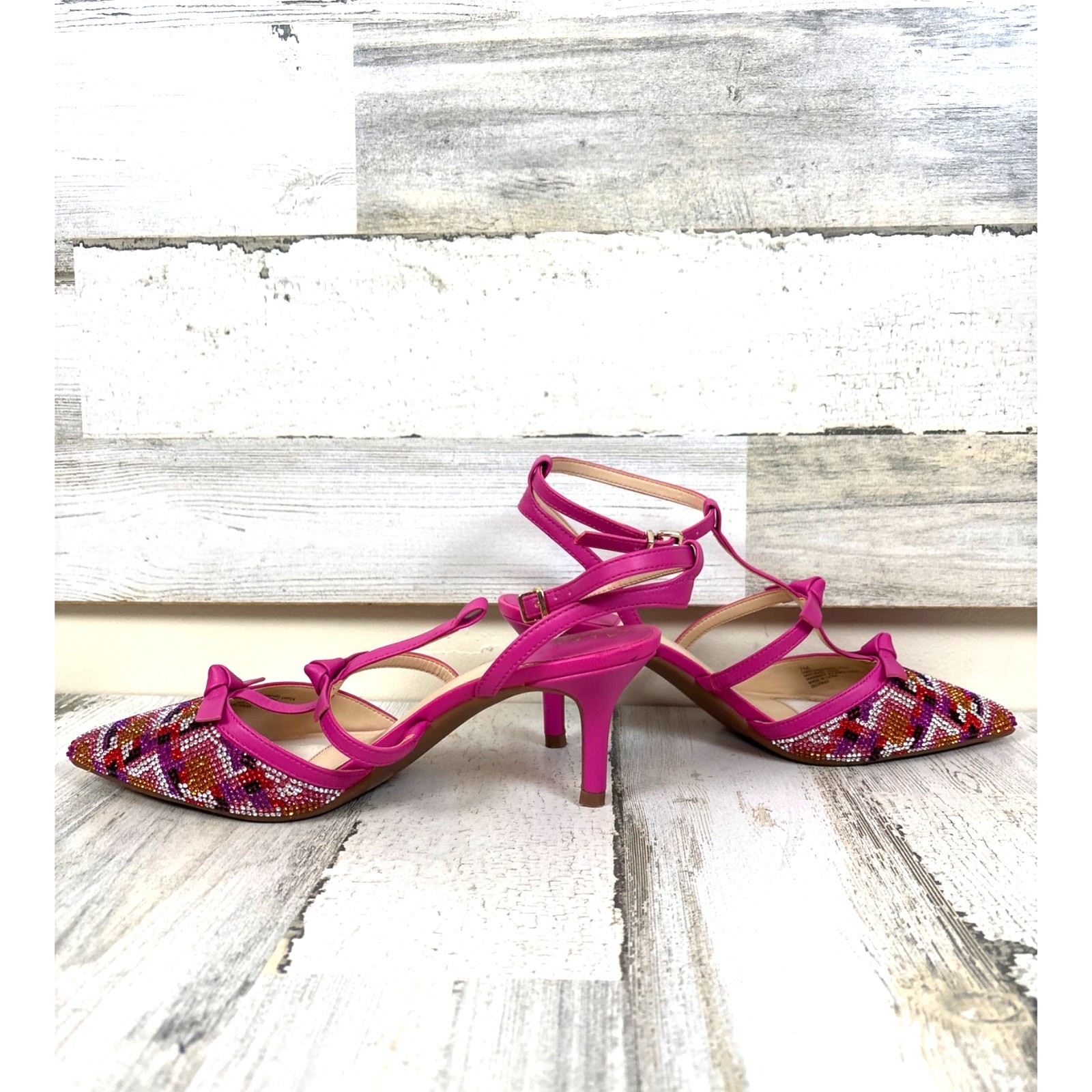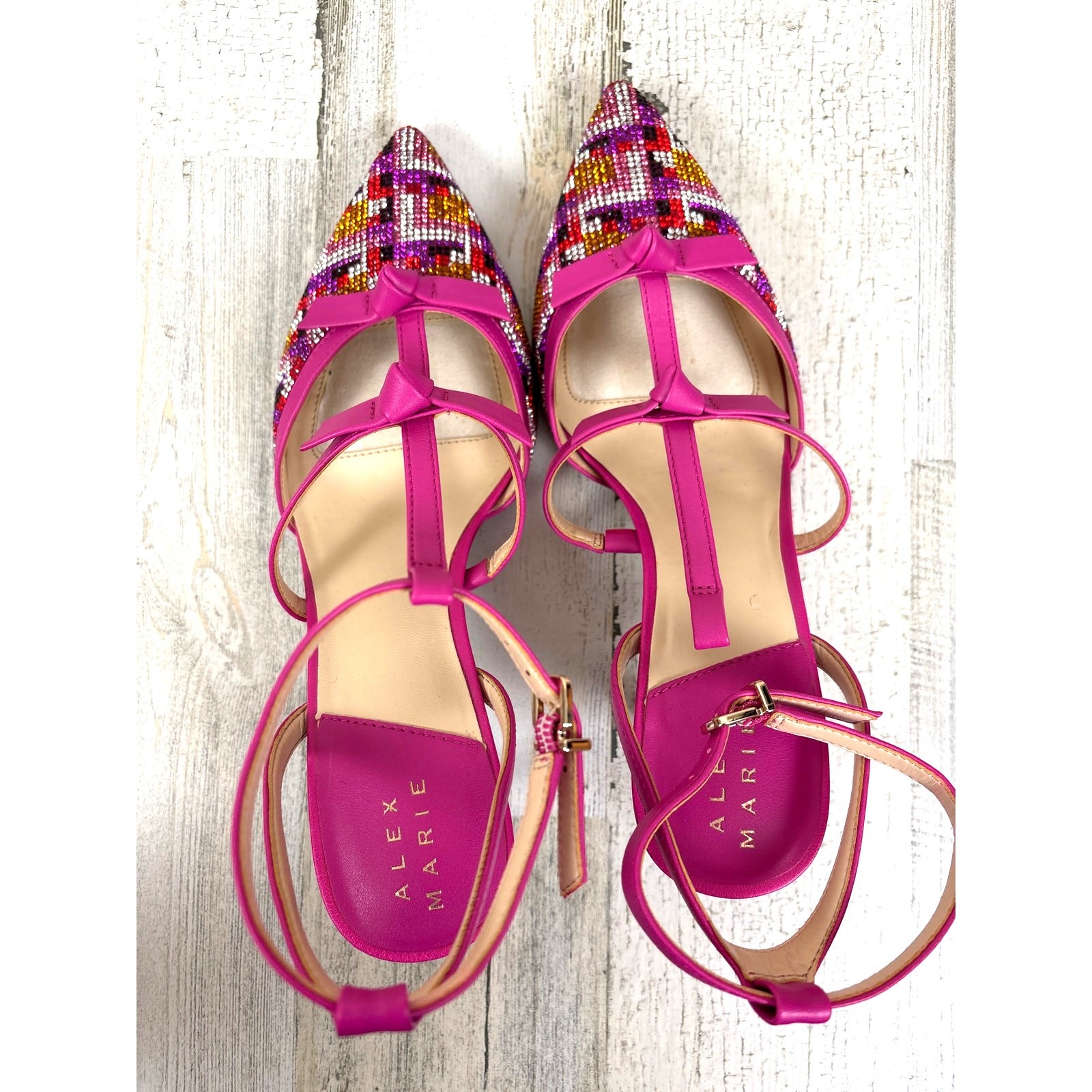 как выглядит Alex Marie Womens 7 Pink Satin Rhinestone Strappy Heels Pumps Formal Party Prom фото