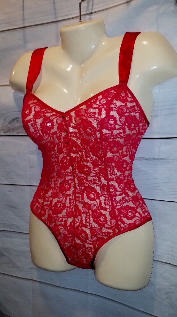 VTG Victoria's Secret Gold Label Red Teddy Romper 1 Piece Lace Button Sheer NEW