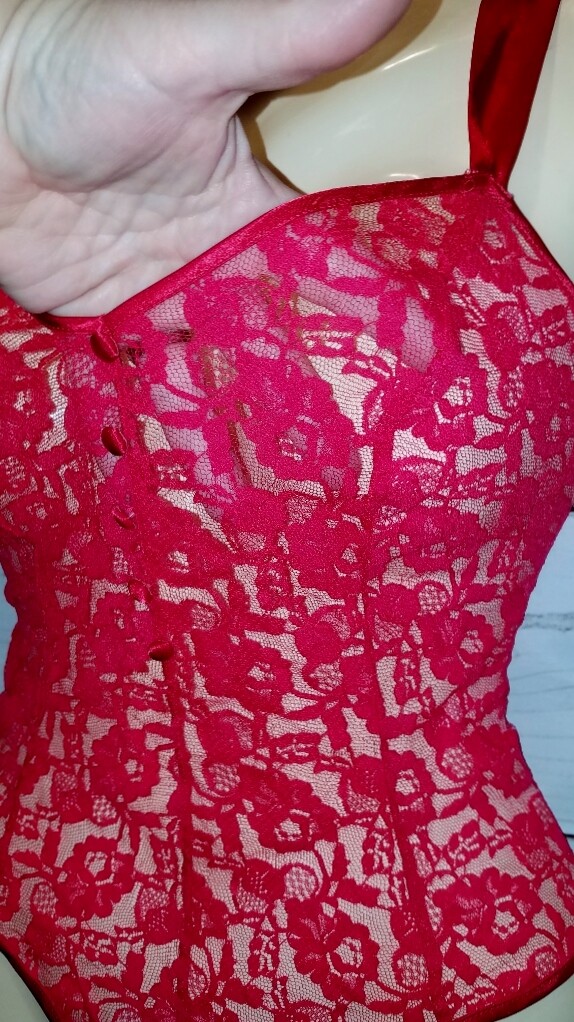 как выглядит VTG Victorias Secret Gold Label Red Teddy Romper 1 Piece Lace Button Sheer NEW фото