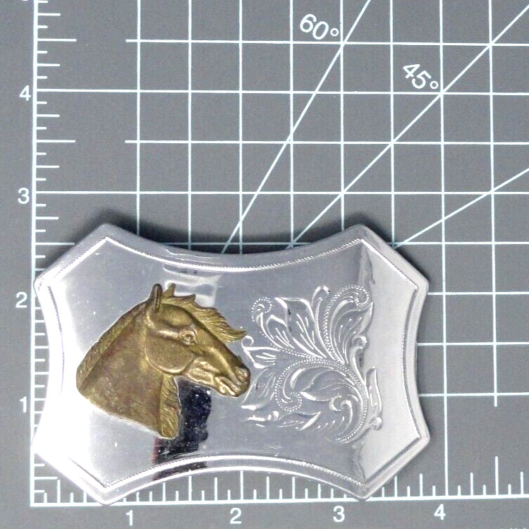 Western Horse Head Belt Buckle Scroll Flourish Chrome Like Finish Vtg 70s.GTA148