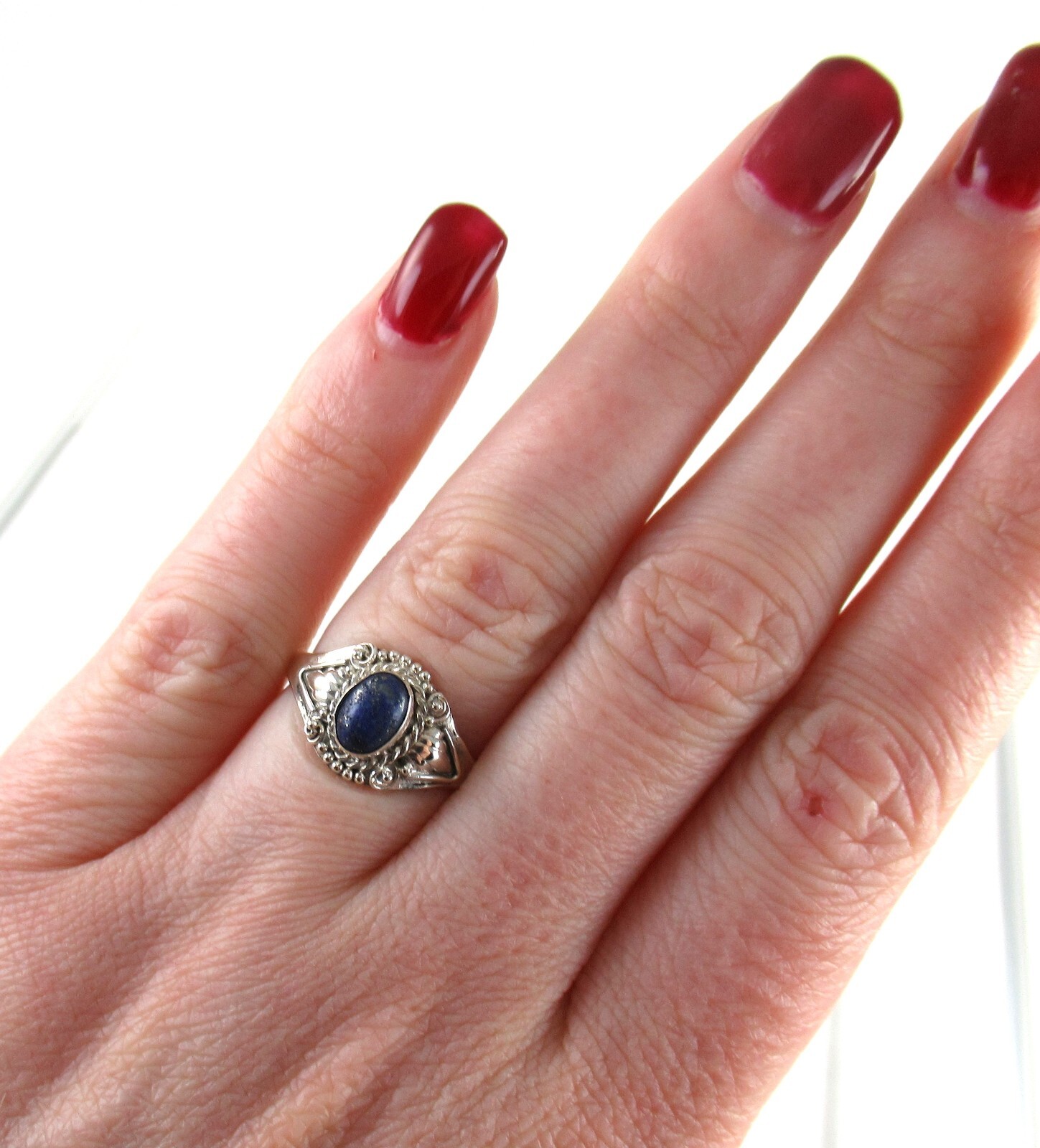 .925 Sterling Silver Lapis Ring Vintage Boho Hippie Bali Ornate size 6.5