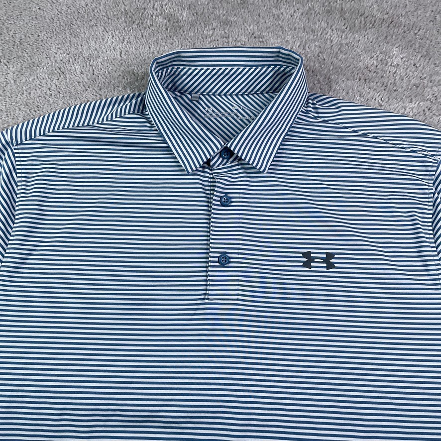 как выглядит Under Armour Polo Shirt Mens XL Blue White Stripes Performance Golf Heat Gear фото