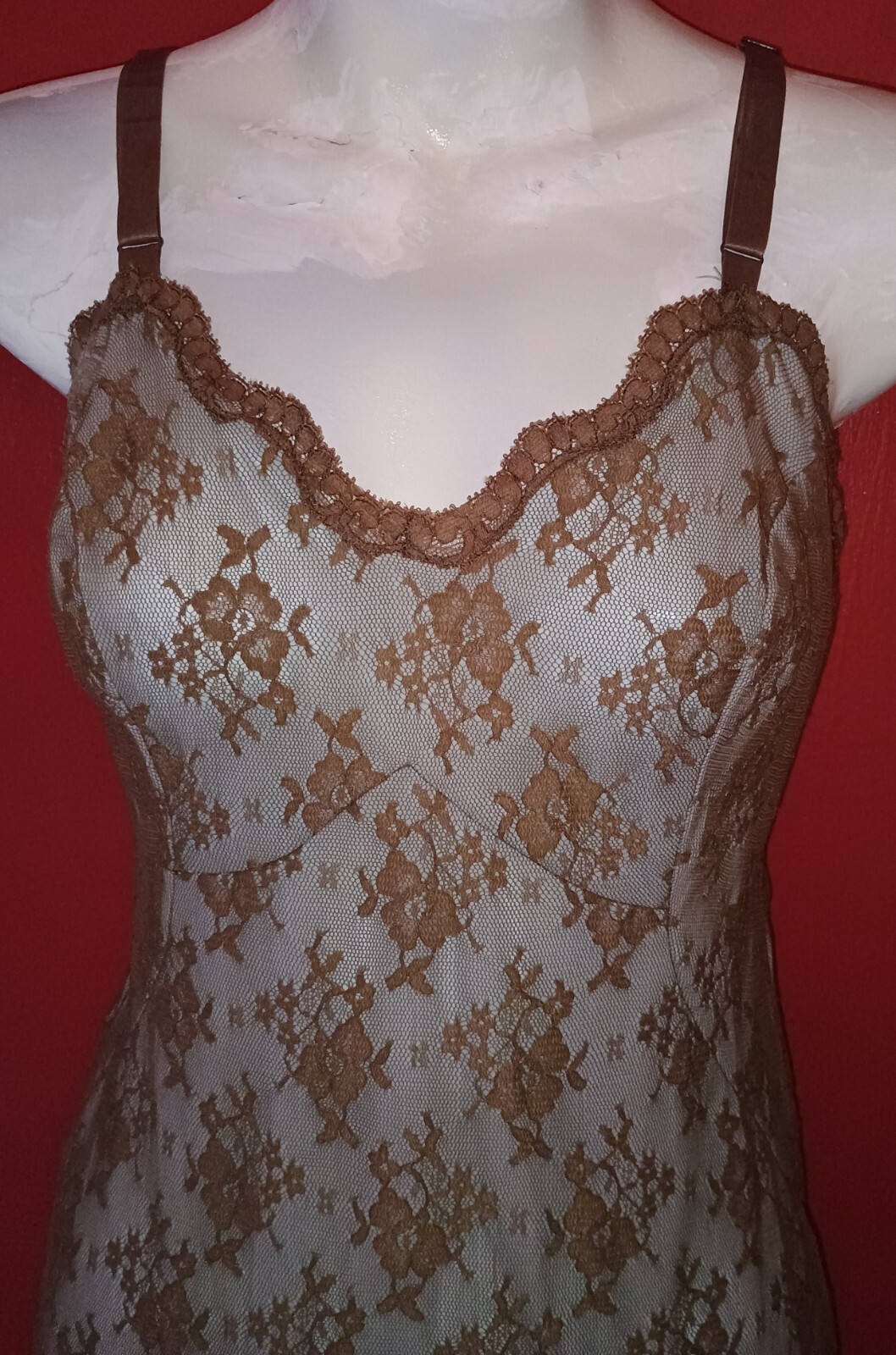 Vintage Gossard Artemis Slip Dress Blue Brown Lace Dbl Nylon Sz 34