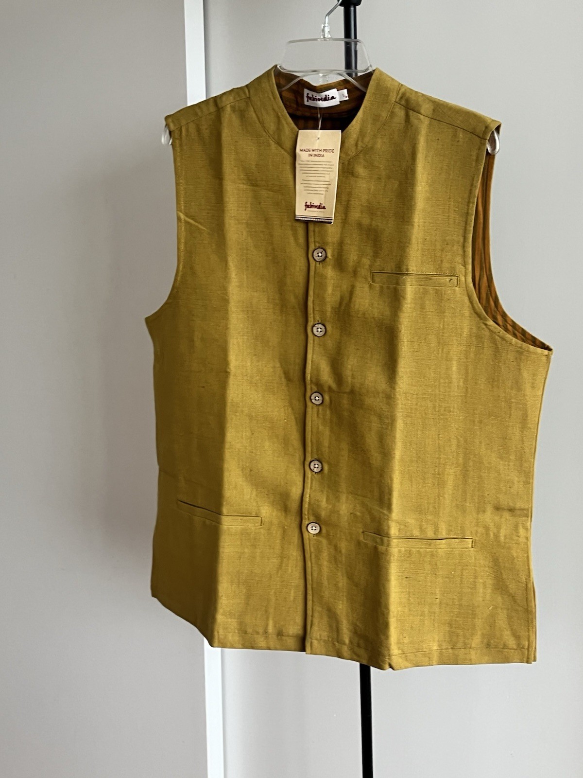 NWT Fabindia Men Sleeveless Modi Jacket Vest Nehru Collar Woven Cotton Mustard L