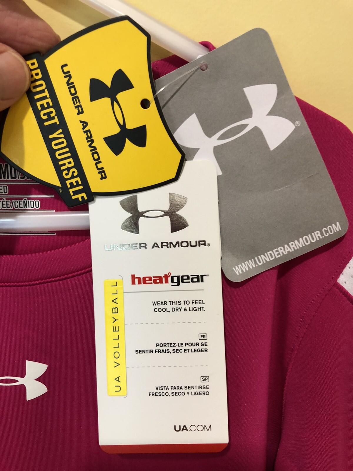 как выглядит Under Armour Girl s Youth Medium L/S T-Shirt NWT Fuchsia White Fitted Heatgear фото
