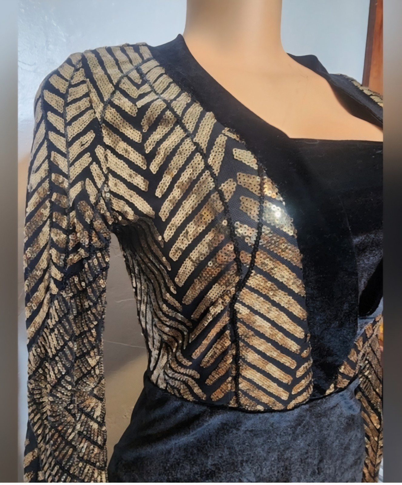 как выглядит Miss Ord Glamorous Black Velvet Evening Dress Gold Sequin Accents Sz SM Formal фото
