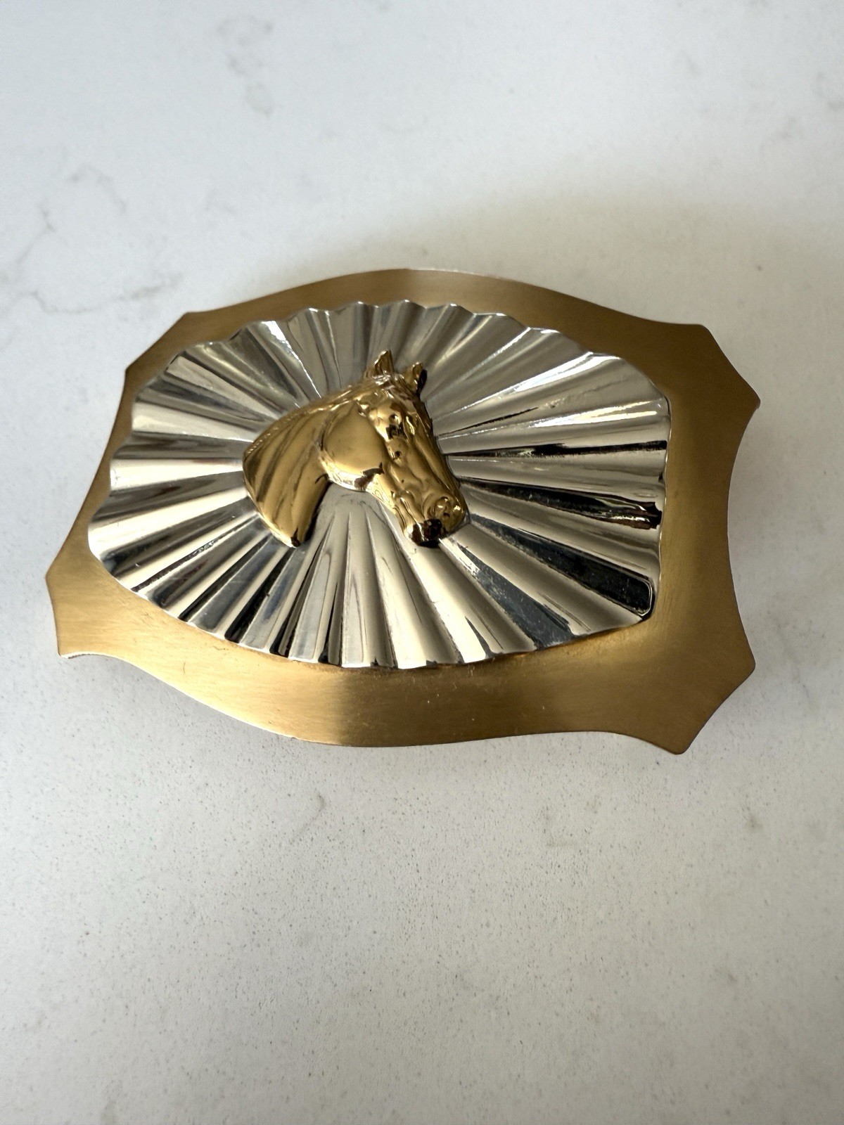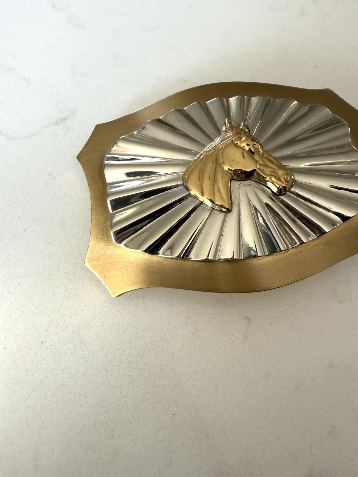 как выглядит Vintage Solid Brass Belt Western Buckle Horse Bronco Mounted Silver Tone Plate фото