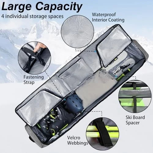 Rolling Ski Bag,Padded Snowboard Bag with Wheels for Air Travel, Fit 190 Grey