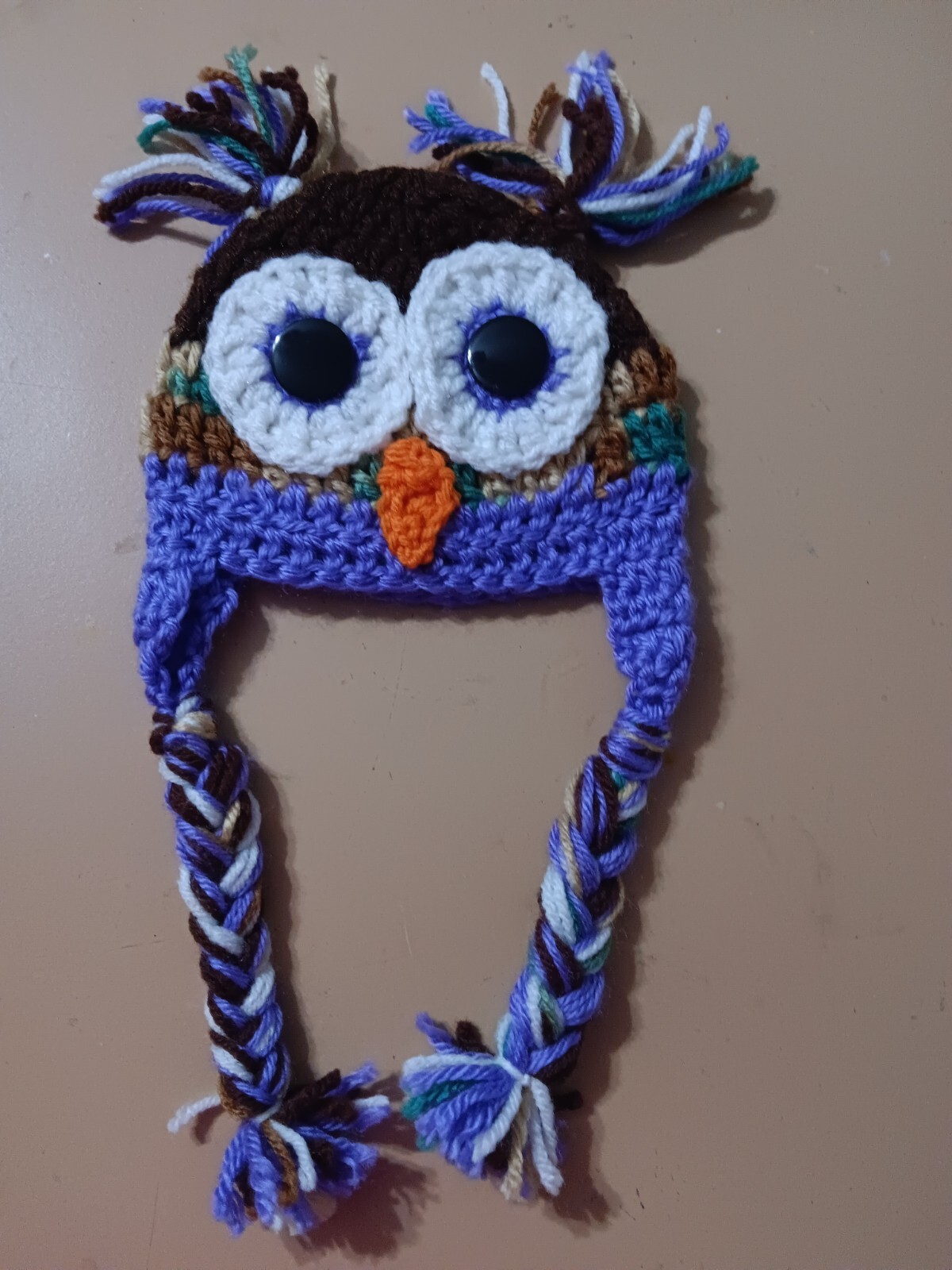 как выглядит Crocheted Purple Brown Unisex 0-3 mo Baby Owl Knit Hat with Braided Ear Flaps фото