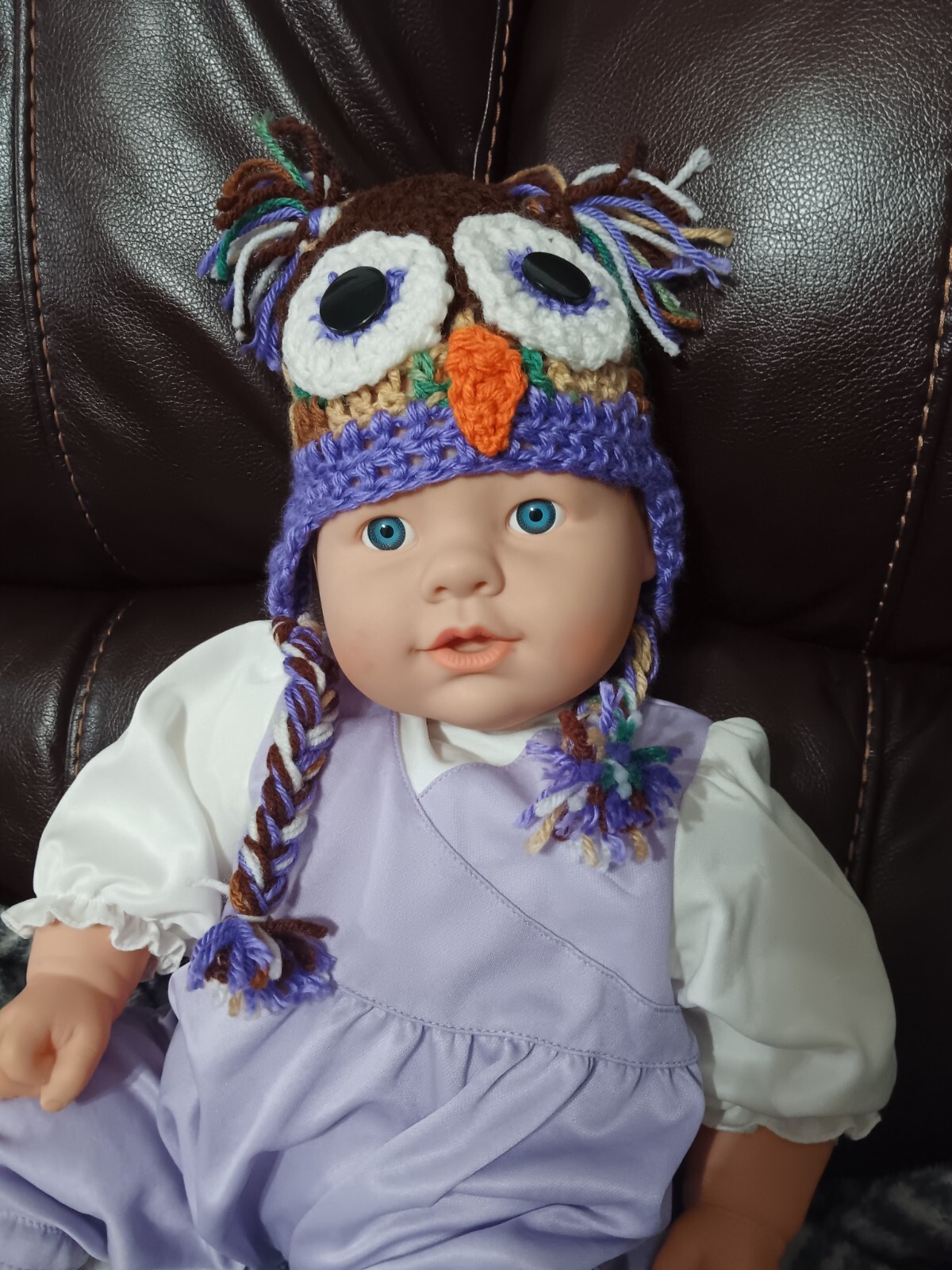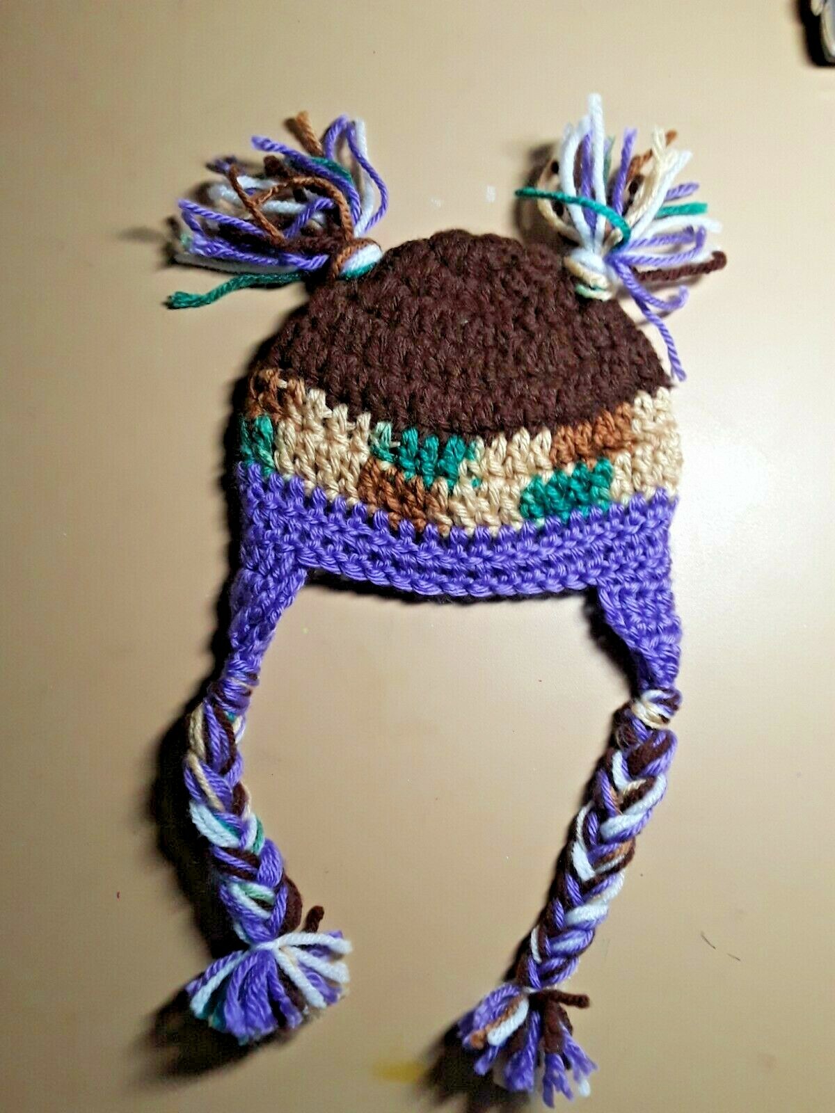 Crocheted Purple Brown Unisex 0-3 mo Baby Owl Knit Hat with Braided Ear Flaps