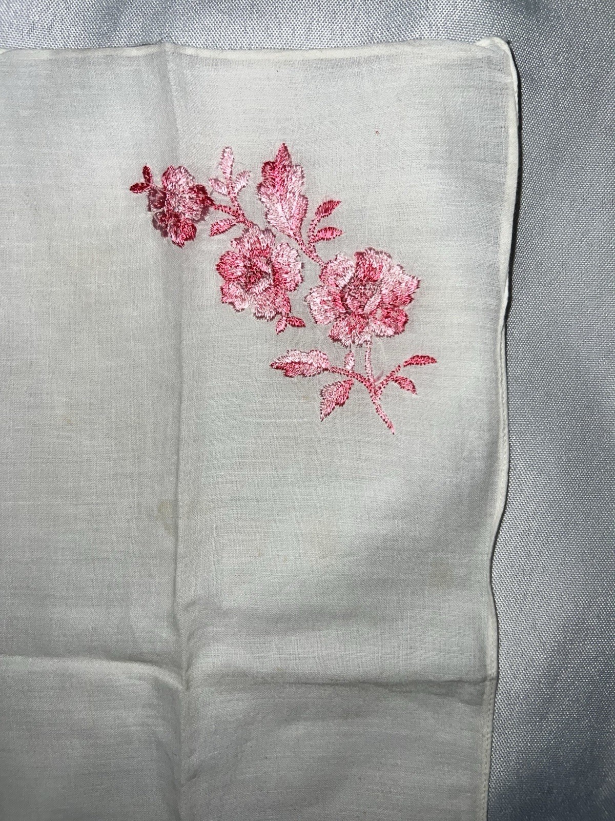 Vintage Embroidered Pink Floral Cotton Handkerchief Hankie 11x11