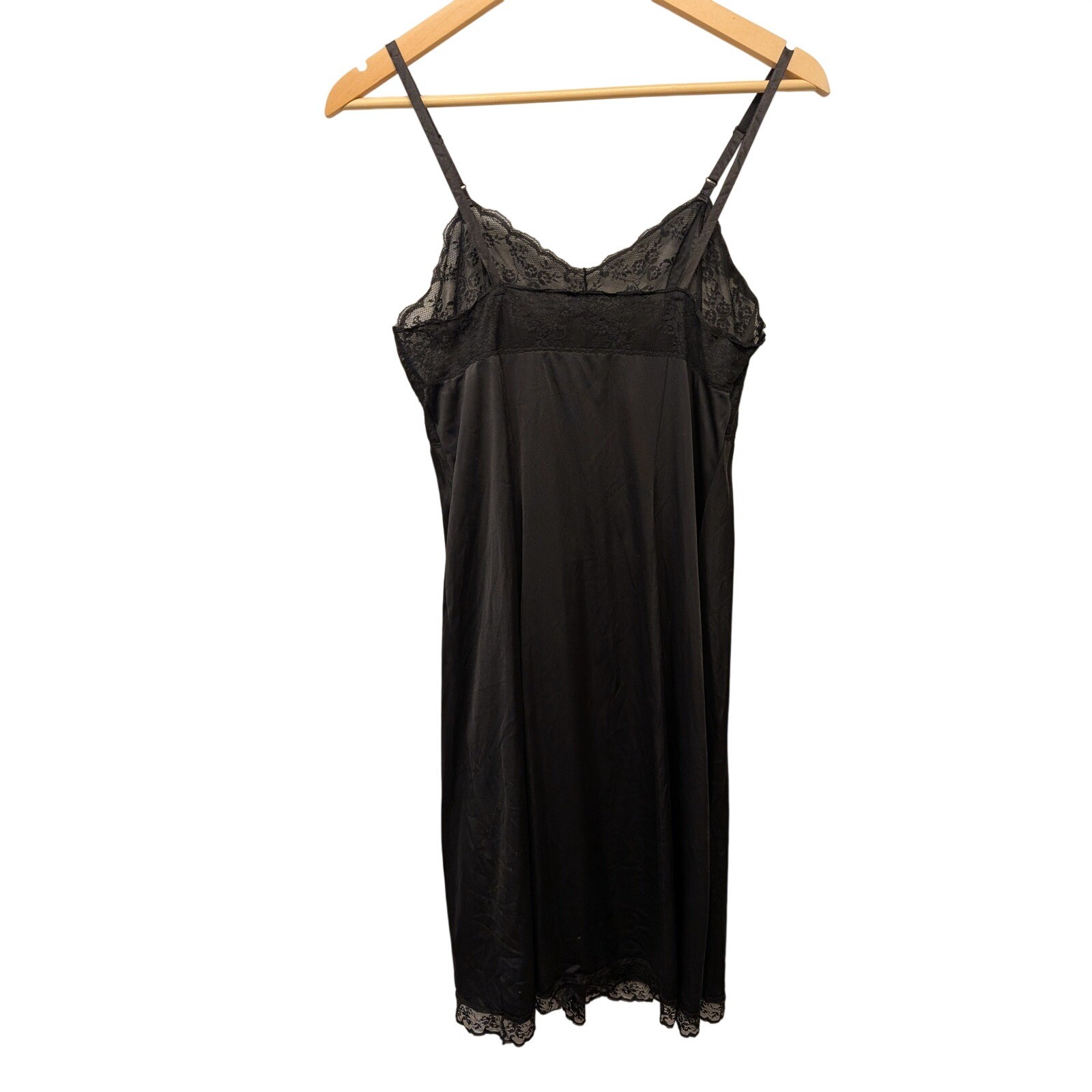 Vintage Vassarette Black Lace Trim Full Slip Dress Satin Lingerie Nightgown