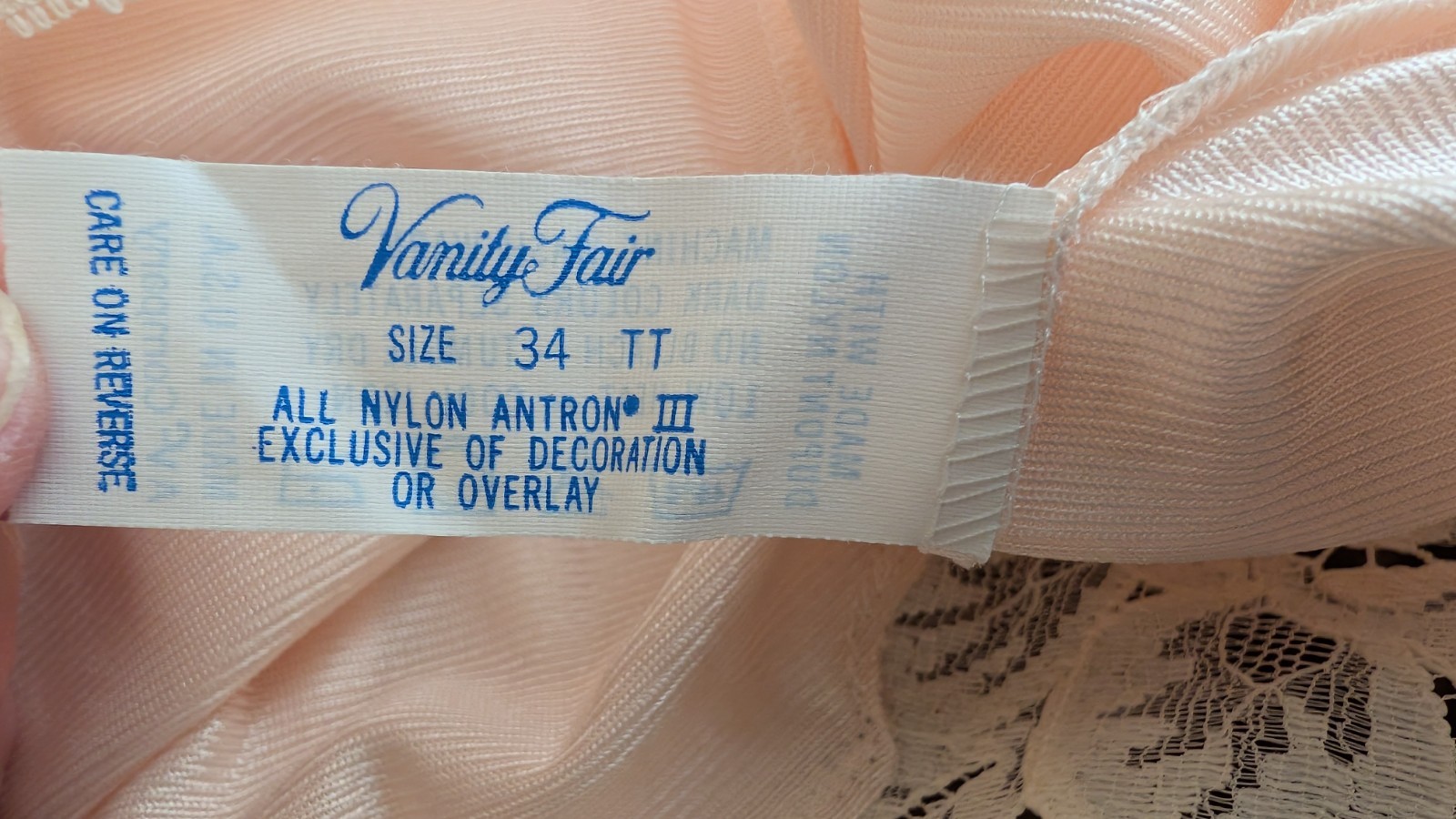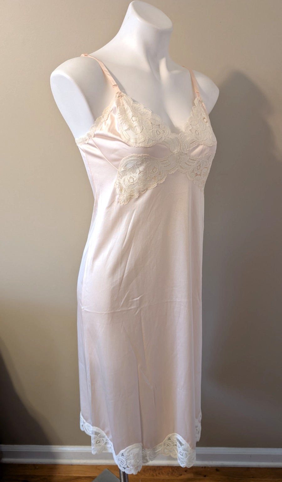 как выглядит Vtg USA 80s Vanity Fair Full Slip 34 TT Nylon Blush Pinkw/Beige Lace Trim NWOT фото