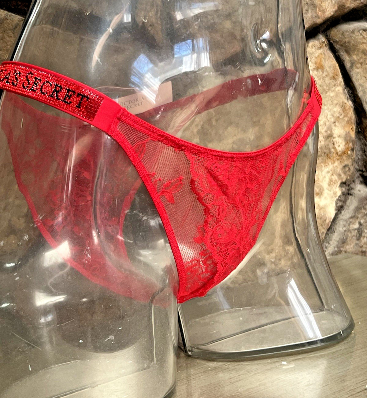 как выглядит Victorias Secret Shine Strap Lace Crotchless Brazilian Panty Sz M LIPSTICK NWT фото