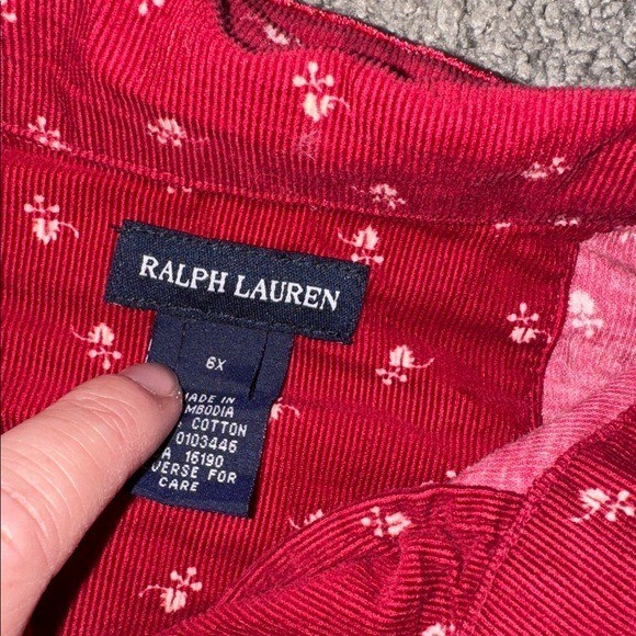 как выглядит Ralph Lauren girls red cotton corduroy shirtdress 6X long sleeve Peter Pan фото