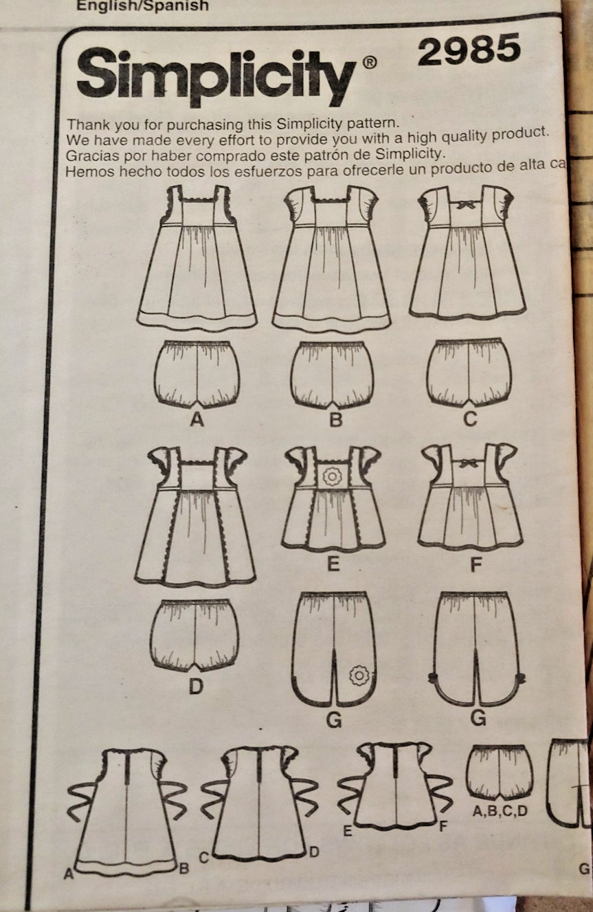 Simplicity 2985 Babies dress in two lengths, Top, Cropped Pants, Panties xxs-L