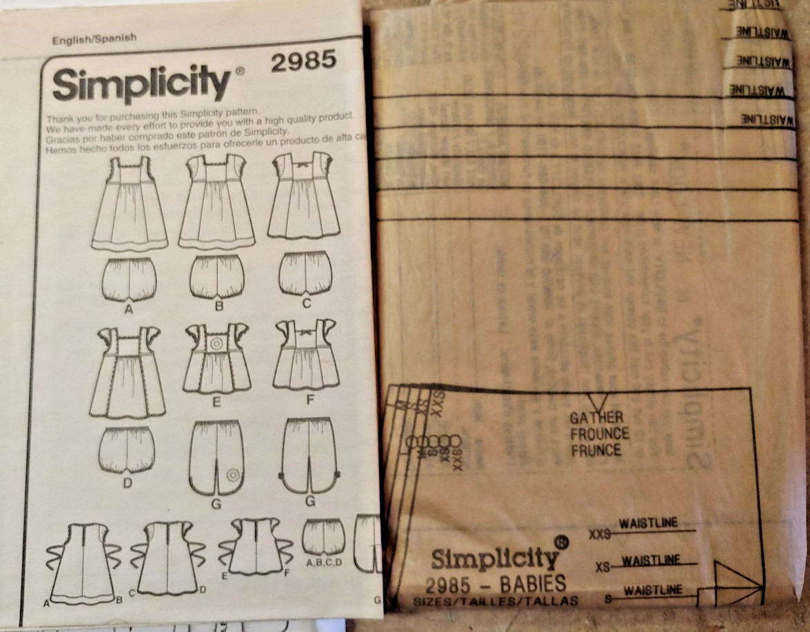 • Simplicity 2985 Babies dress in two lengths, Top, Cropped Pants, Panties xxs-L