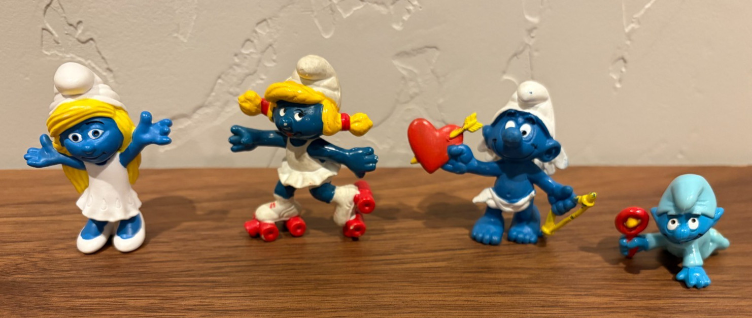 4 DIFF Smurf Figures 1980 1984 Roller Skating Smurfette Cupid Baby Smurfs