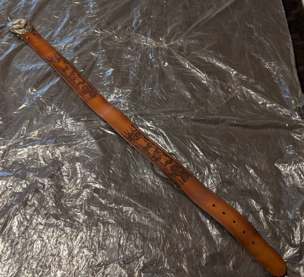 Embossed Hand Tooled Leather Western Belt Horse Steer/Ranch w/Silver Horse Head