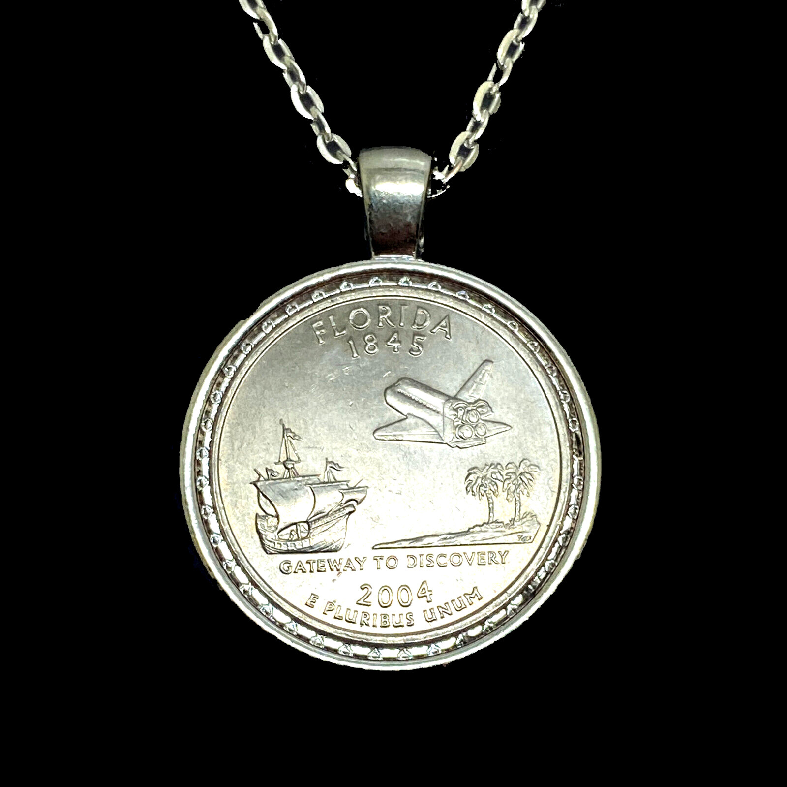 Florida Quarter Coin Pendant Necklace Choose Bezel Color and Chain Length
