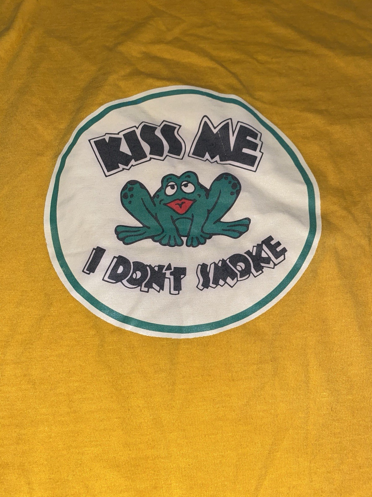 как выглядит Vintage Yellow Kiss Me I Don t Smoke Frog Shirt DownerWear Youth XL 17x26 фото