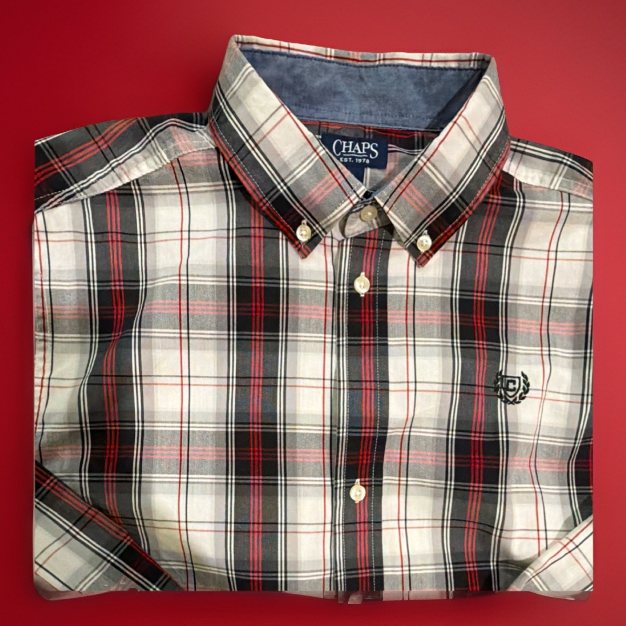 как выглядит Chaps Mens XL White Black Red Plaid Long Sleeve Cotton Button-Up Shirt фото