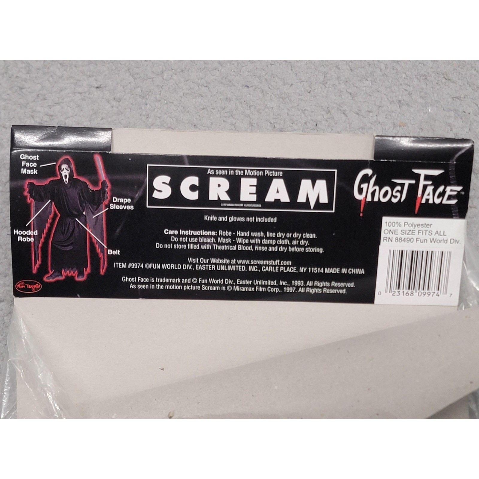 Vintage Ghost Face Fun World EU Scream Mask Black Hood Costume Adult One Sz 90s