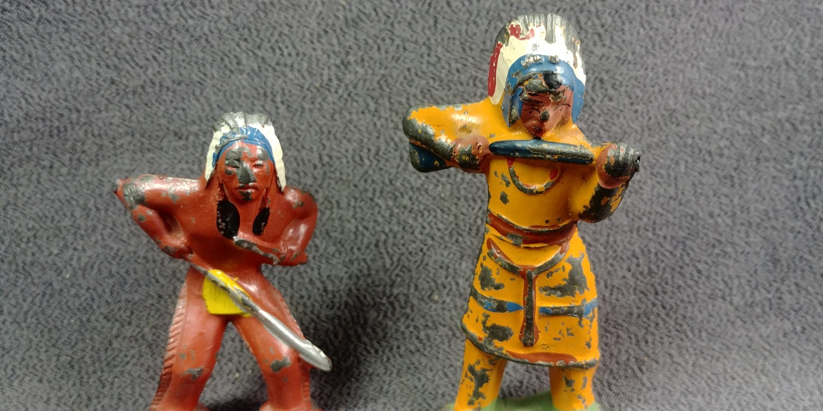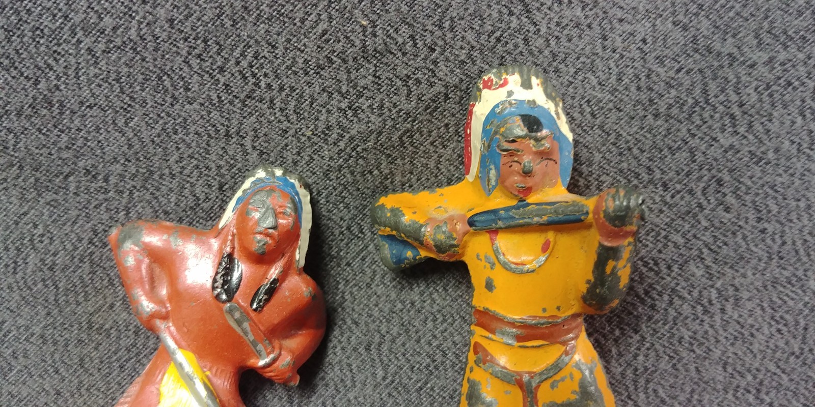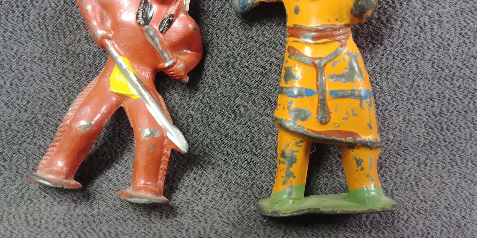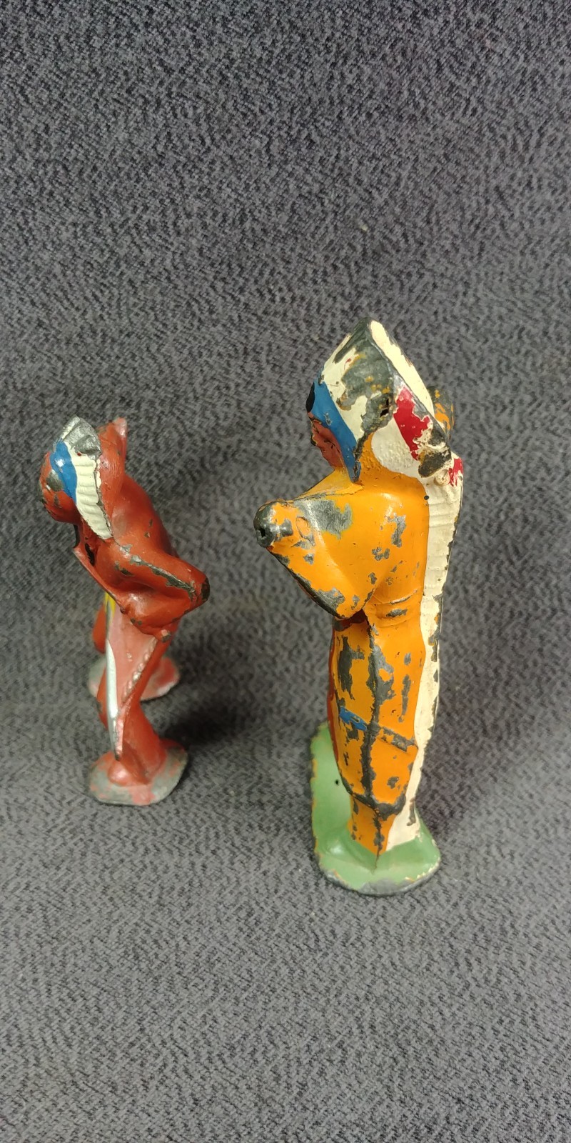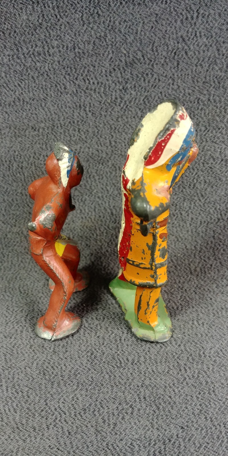 2 Lead Indian Chief Toy Figure Warrior Rifle Spear Knife Unknown Vintage Lot