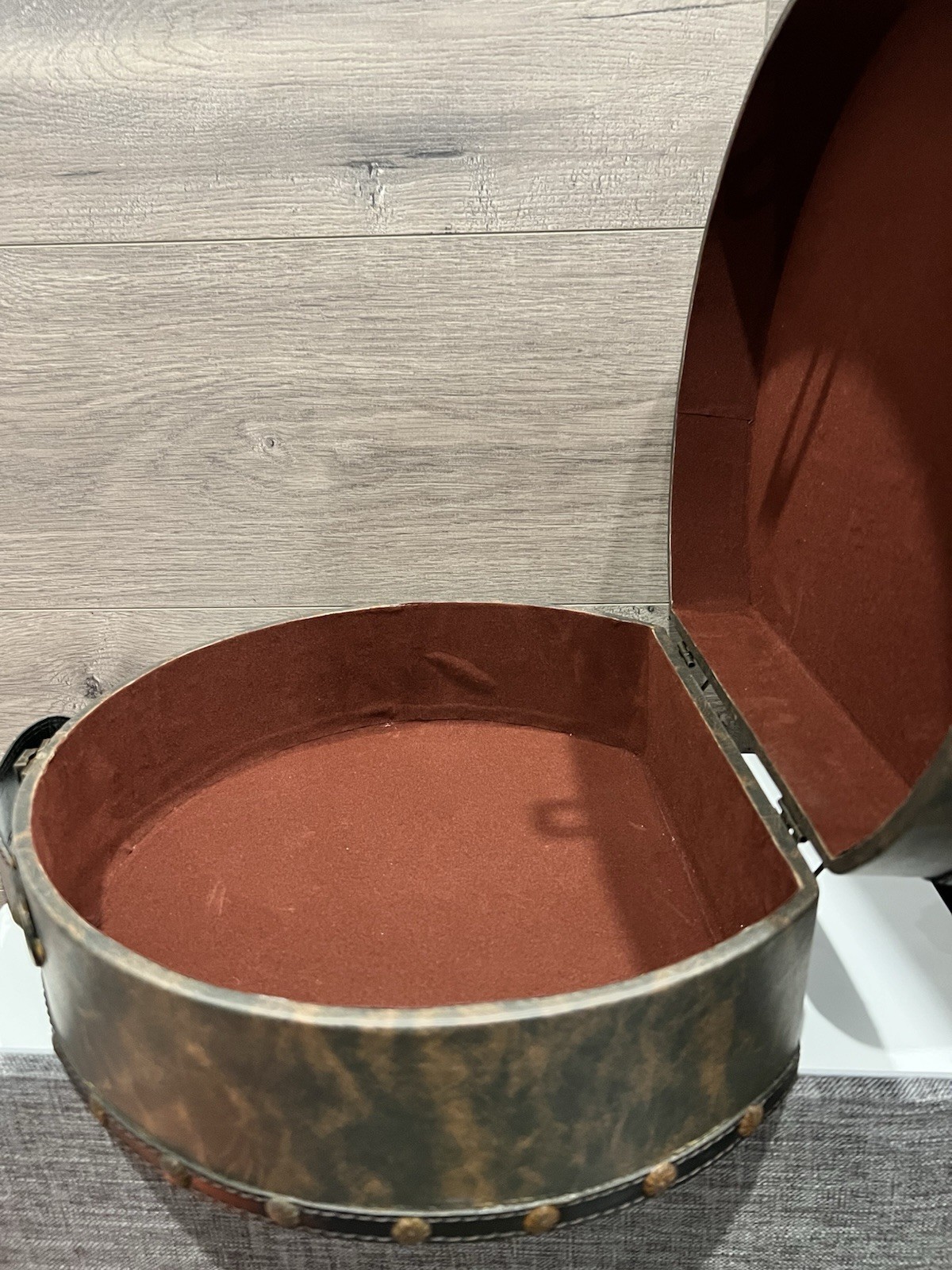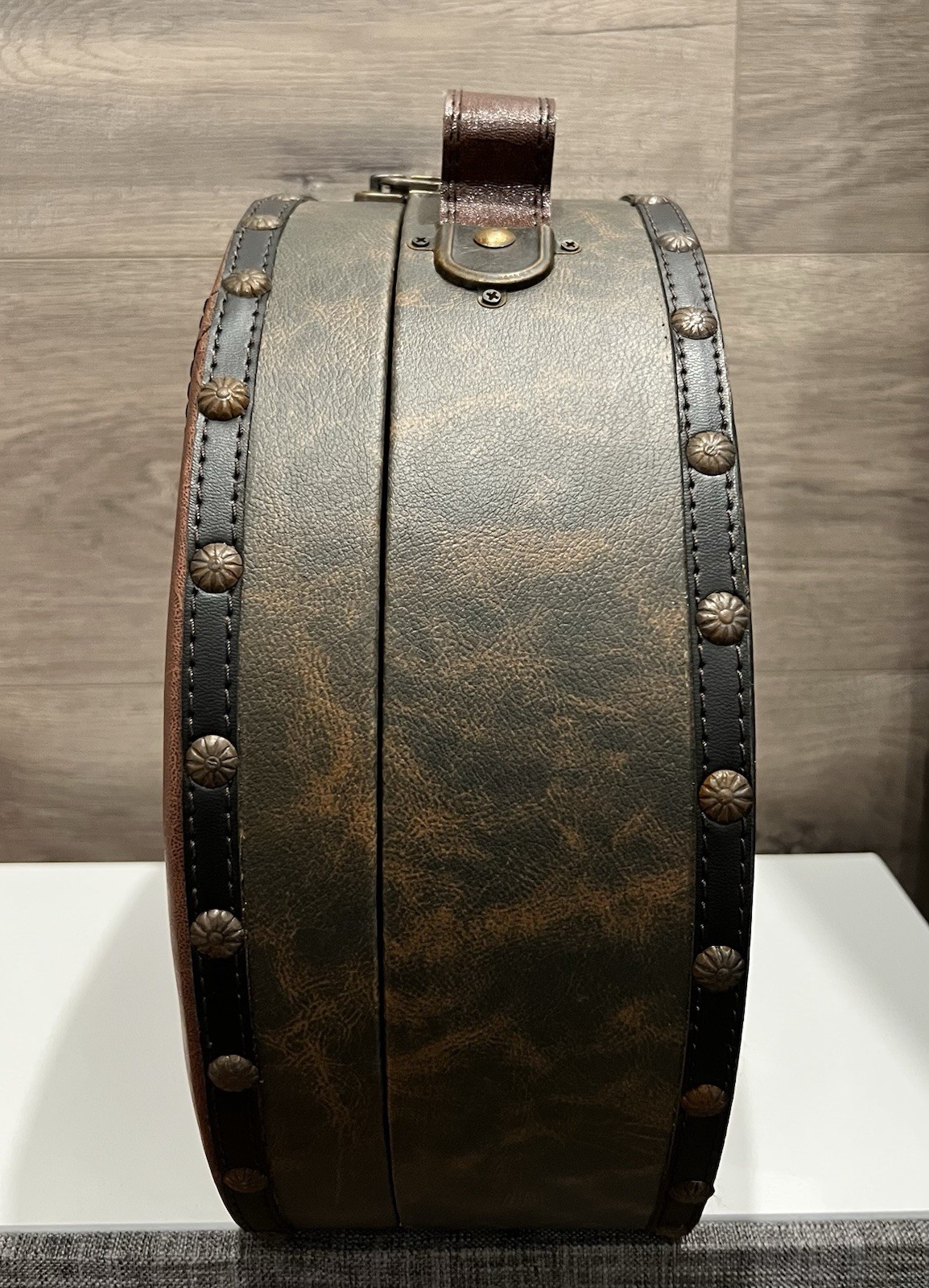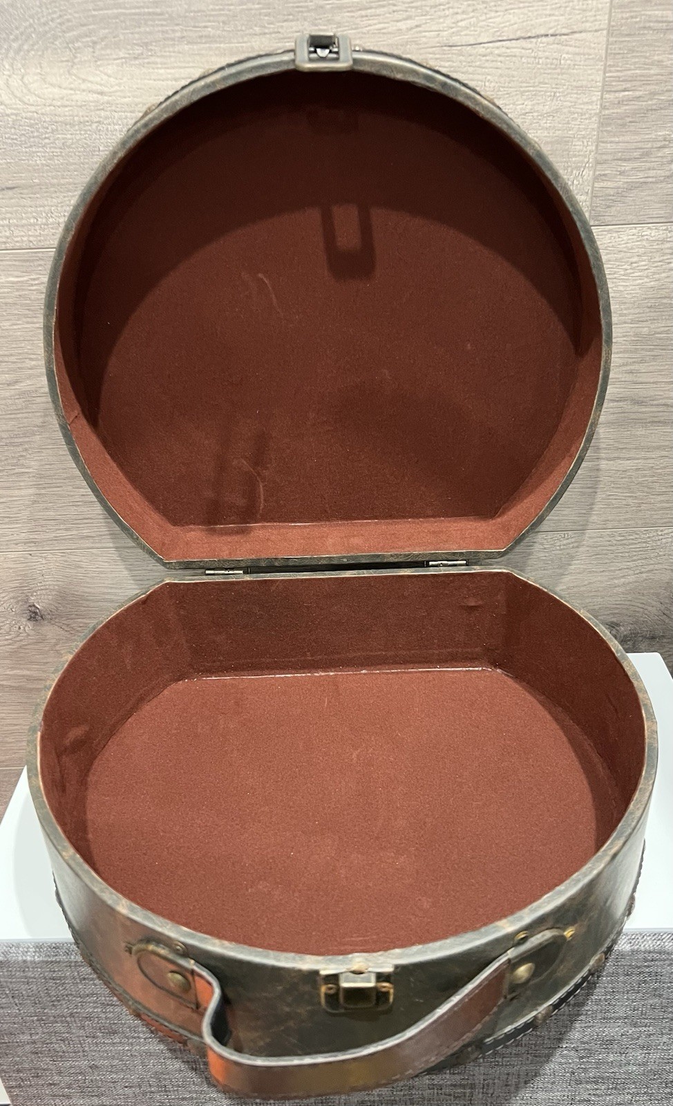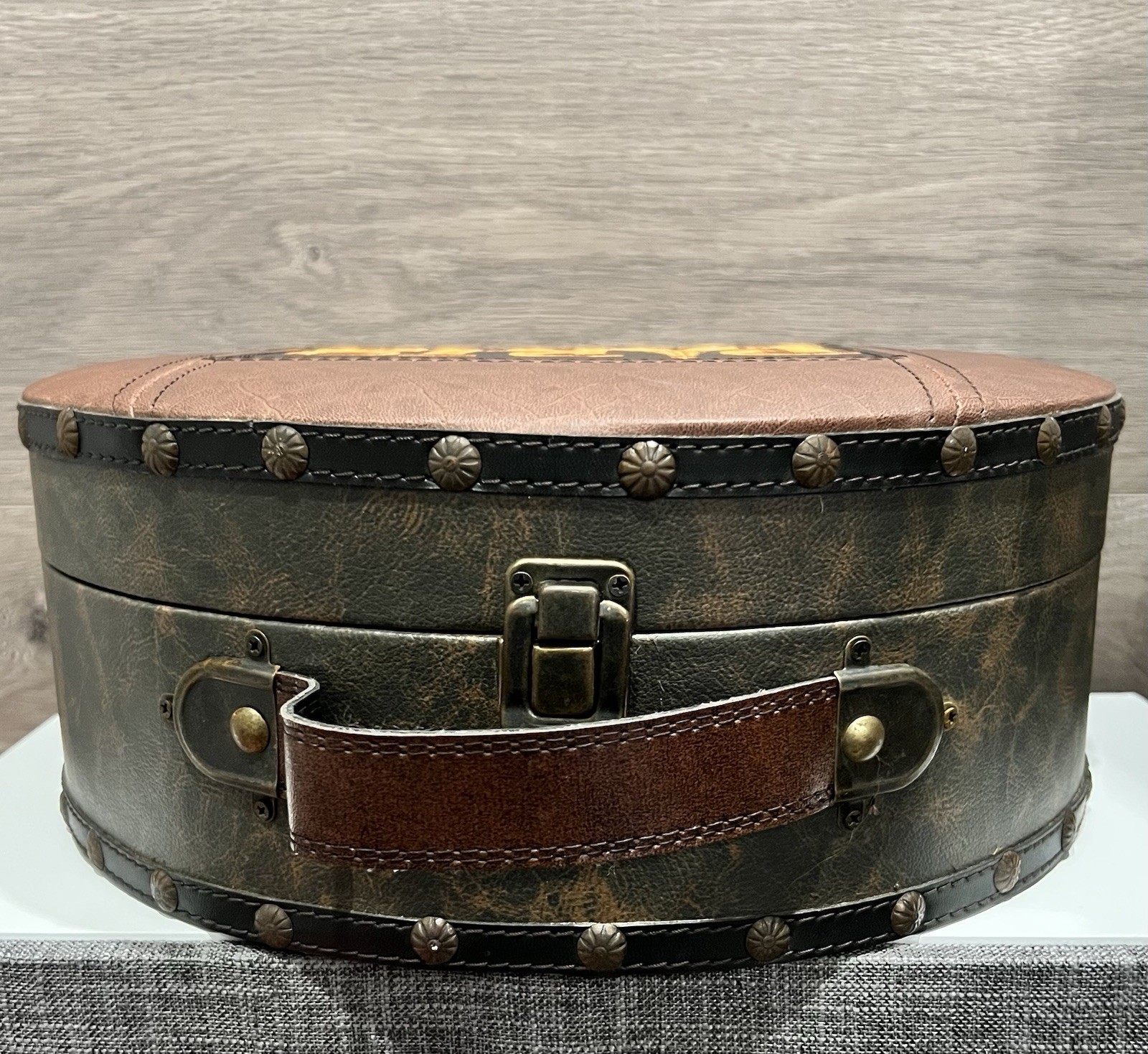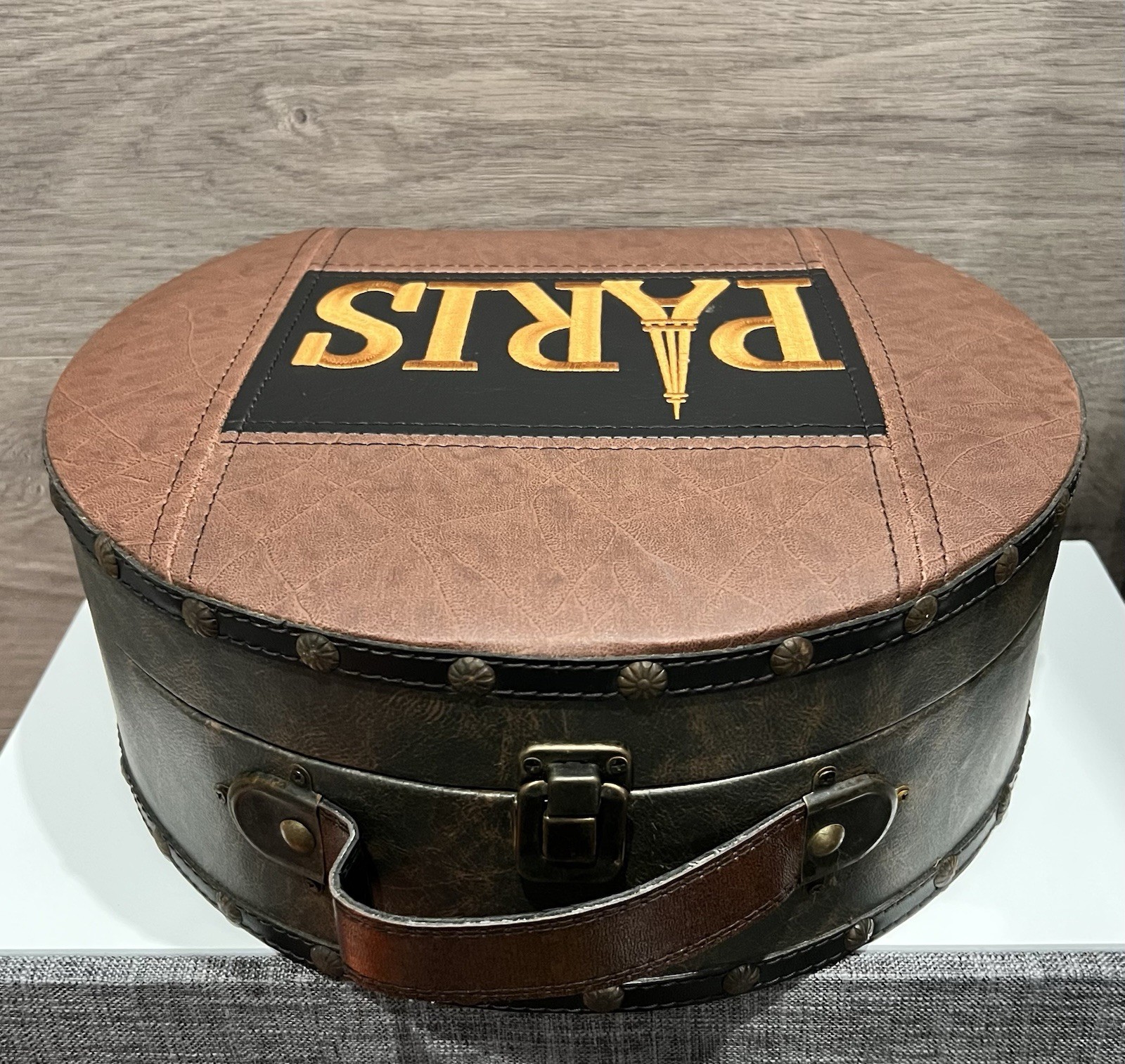 как выглядит Vintage Hat Box w/PARIS Embroidered Faux Leather Traveling Case w/Latch 11 фото