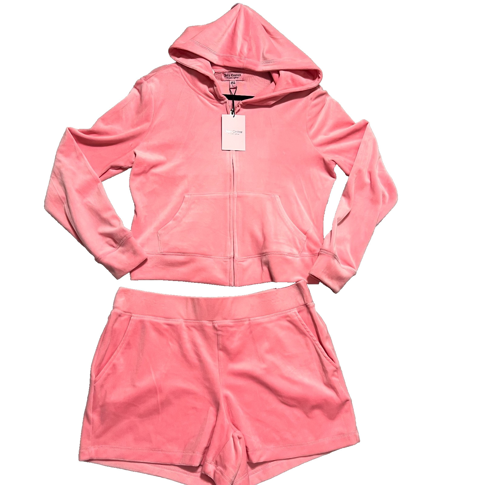 Juicy Couture Bling Velour Tracksuit Hoodie and Shorts LARGE Flamingo Pink NEW