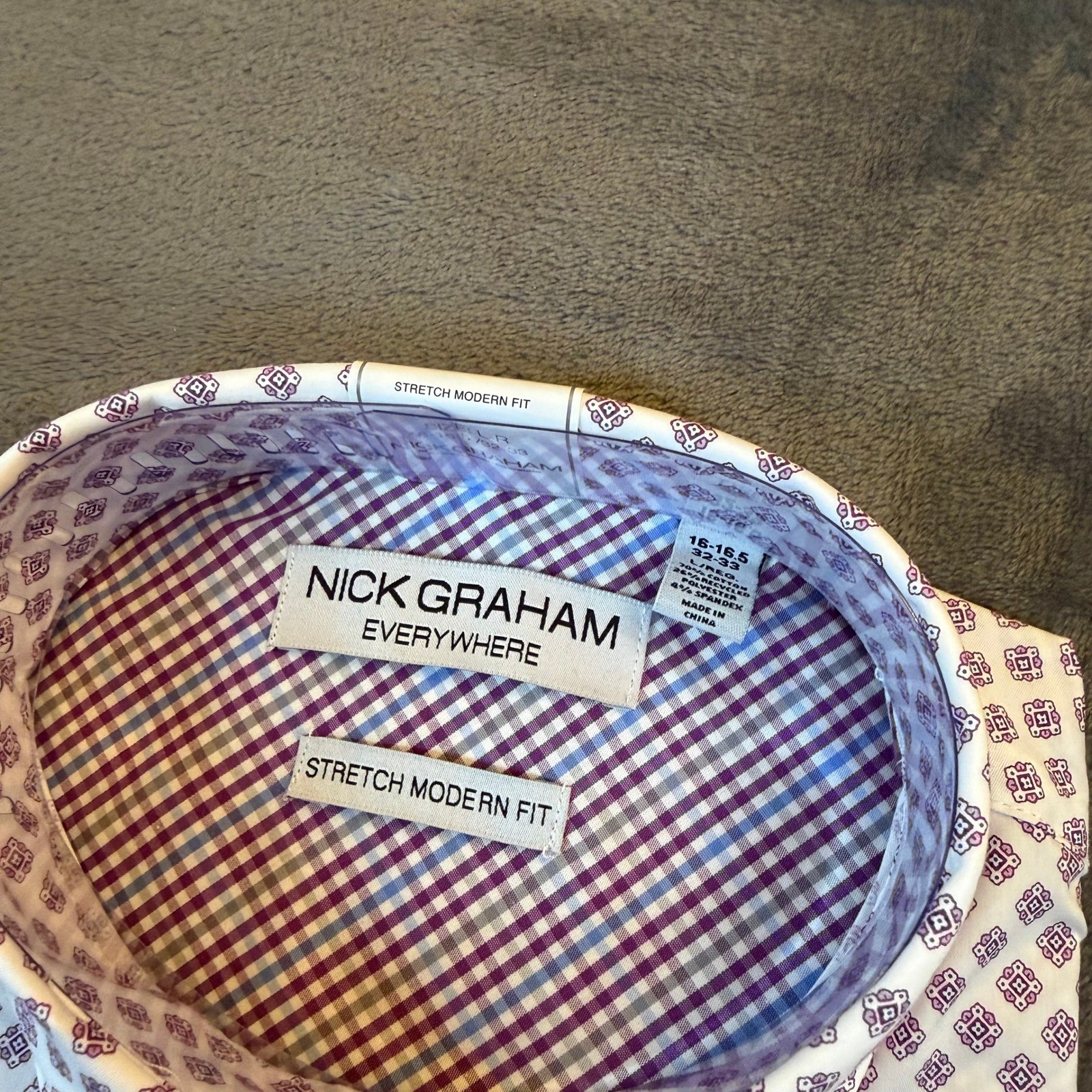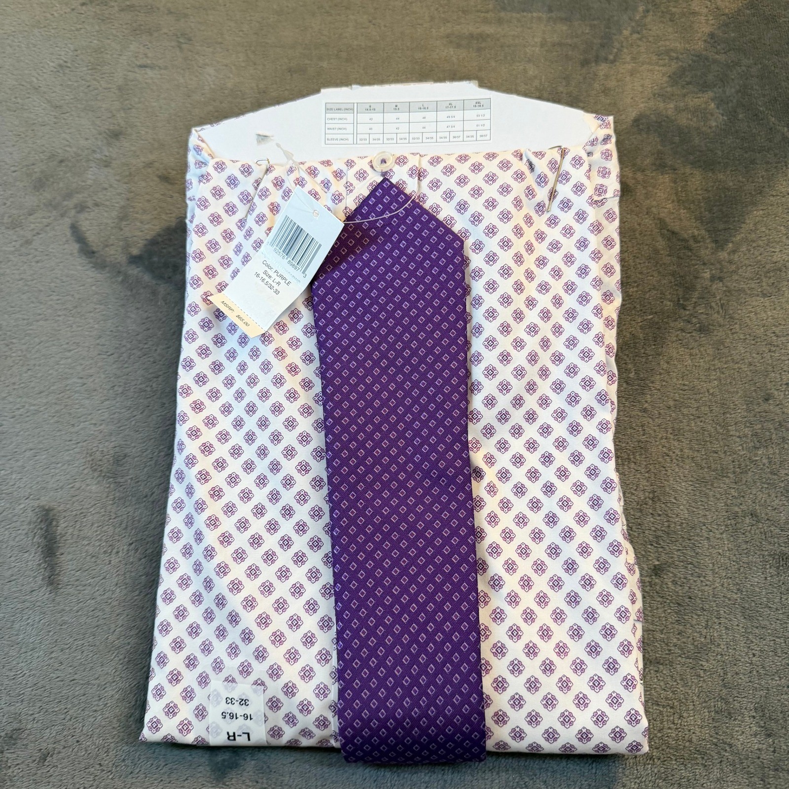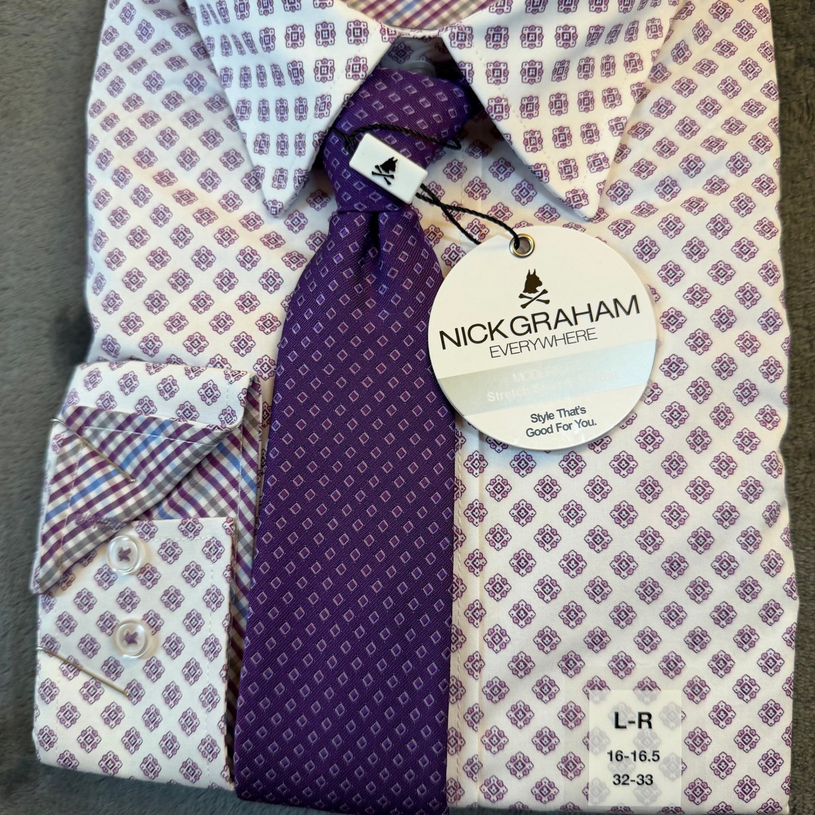 Nick Graham Stretch Modern Fit Dress Shirt Tie Set Purple Geo Print Mens Large