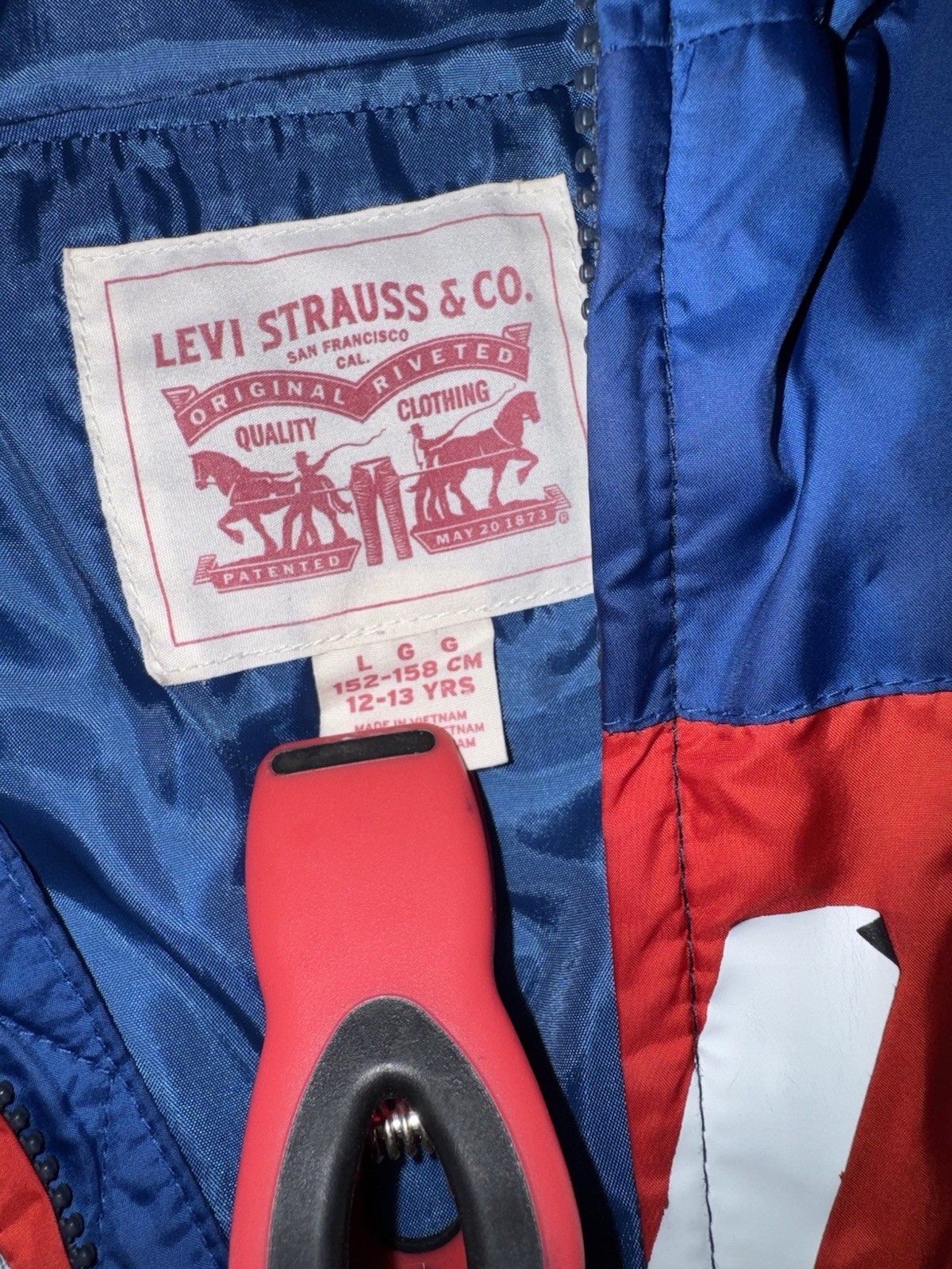 LEVIS Boys Size L 12-13 YRS Blue Red Puffer Zip Up Hooded Pockets Jacket