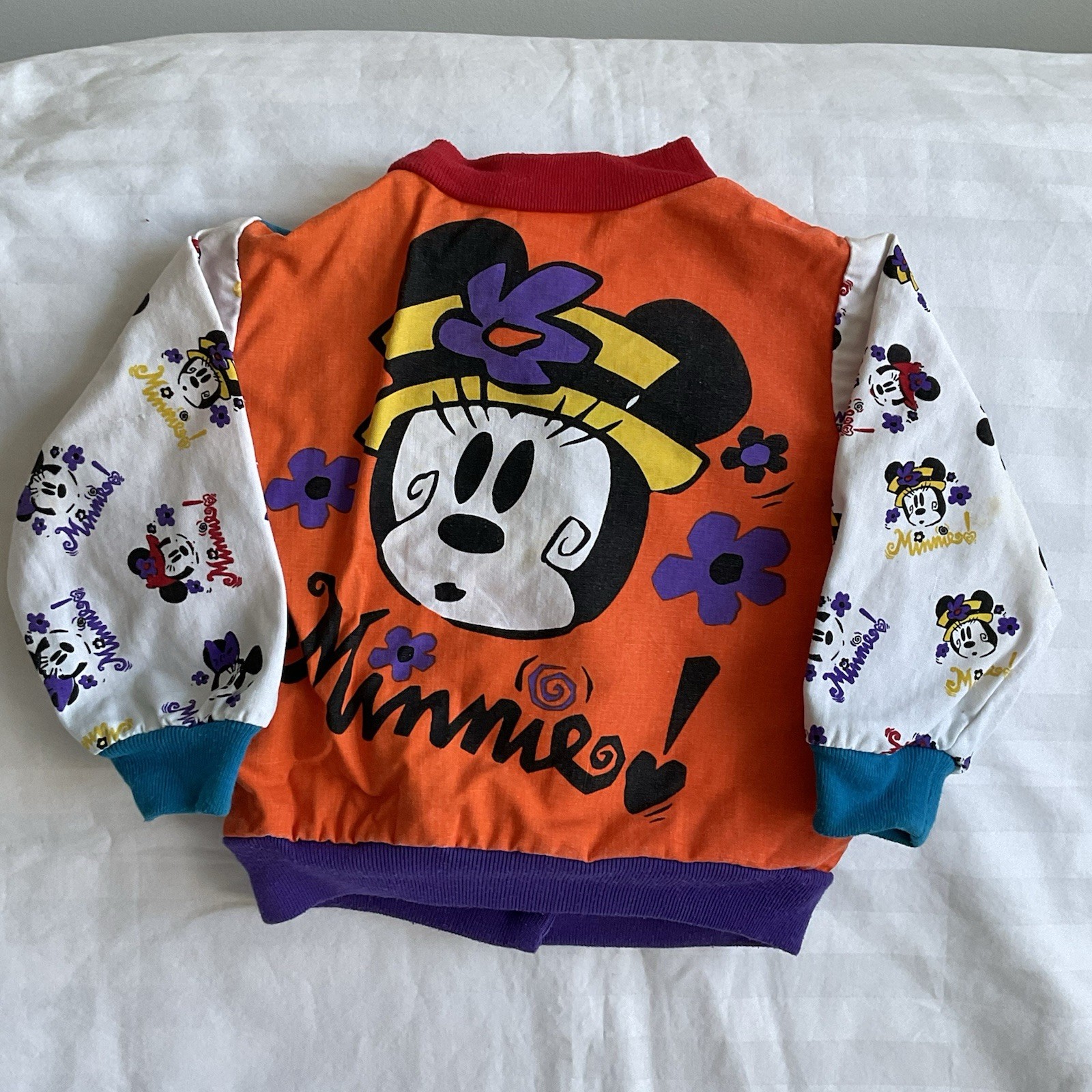 как выглядит Vintage 90s Disney Minnie Mouse AOP Baby Jacket 18M Colorblock Cotton Stained фото