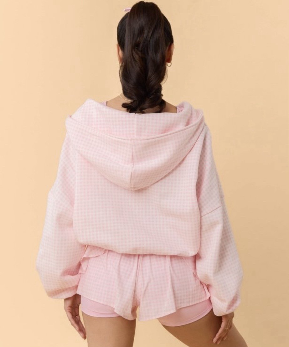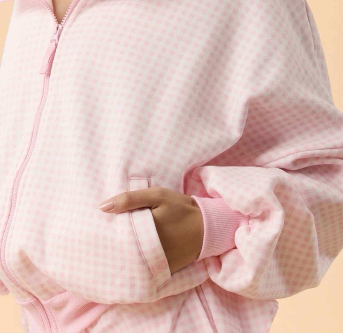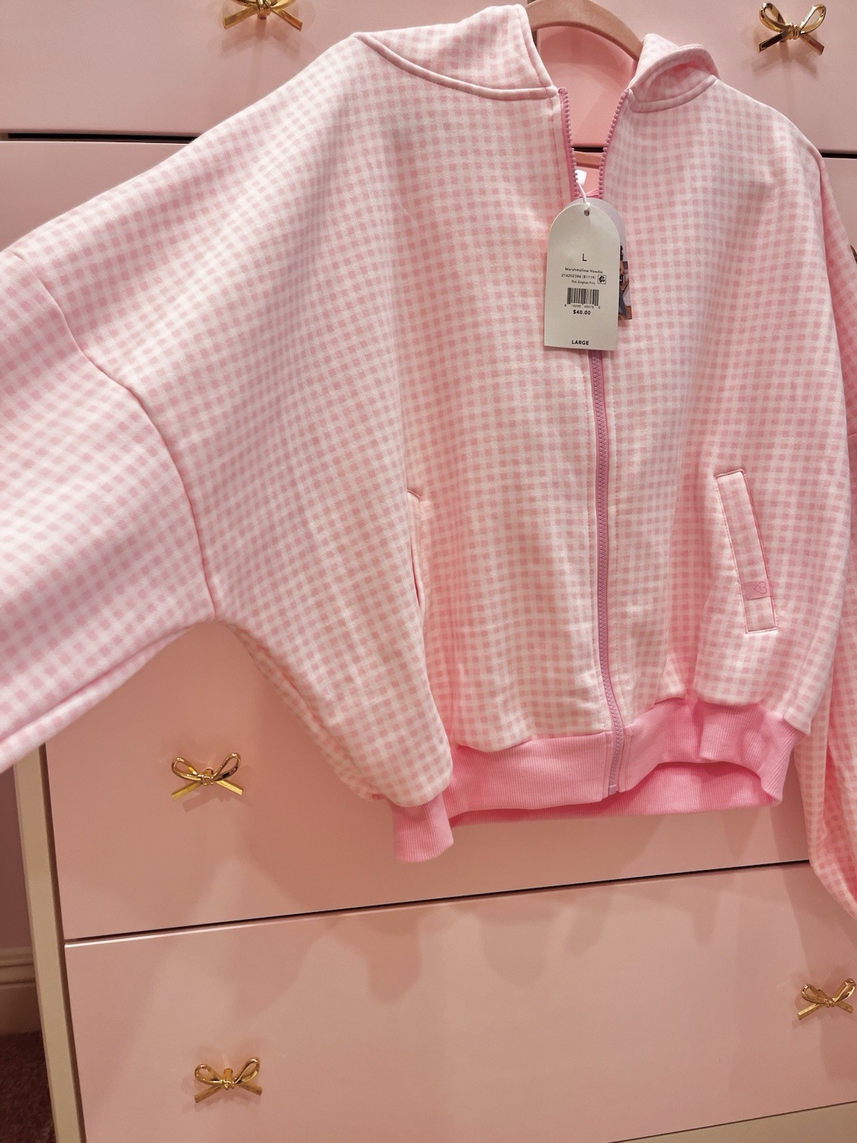 как выглядит Women s Blogilates Marshmallow Hooded Zip Sweatshirt Pink Gingham Size L NWT фото