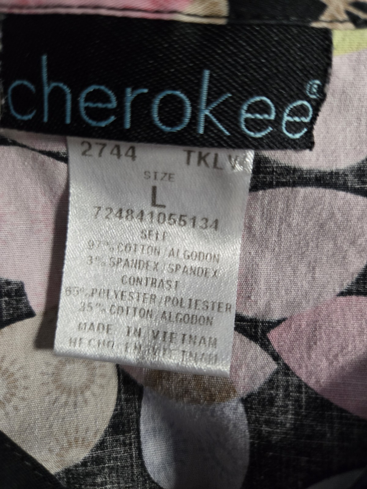 Cherokee Scrub Top size L-Pastel/Black Floral Mock Wrap -Chest 22.5/L 26.5