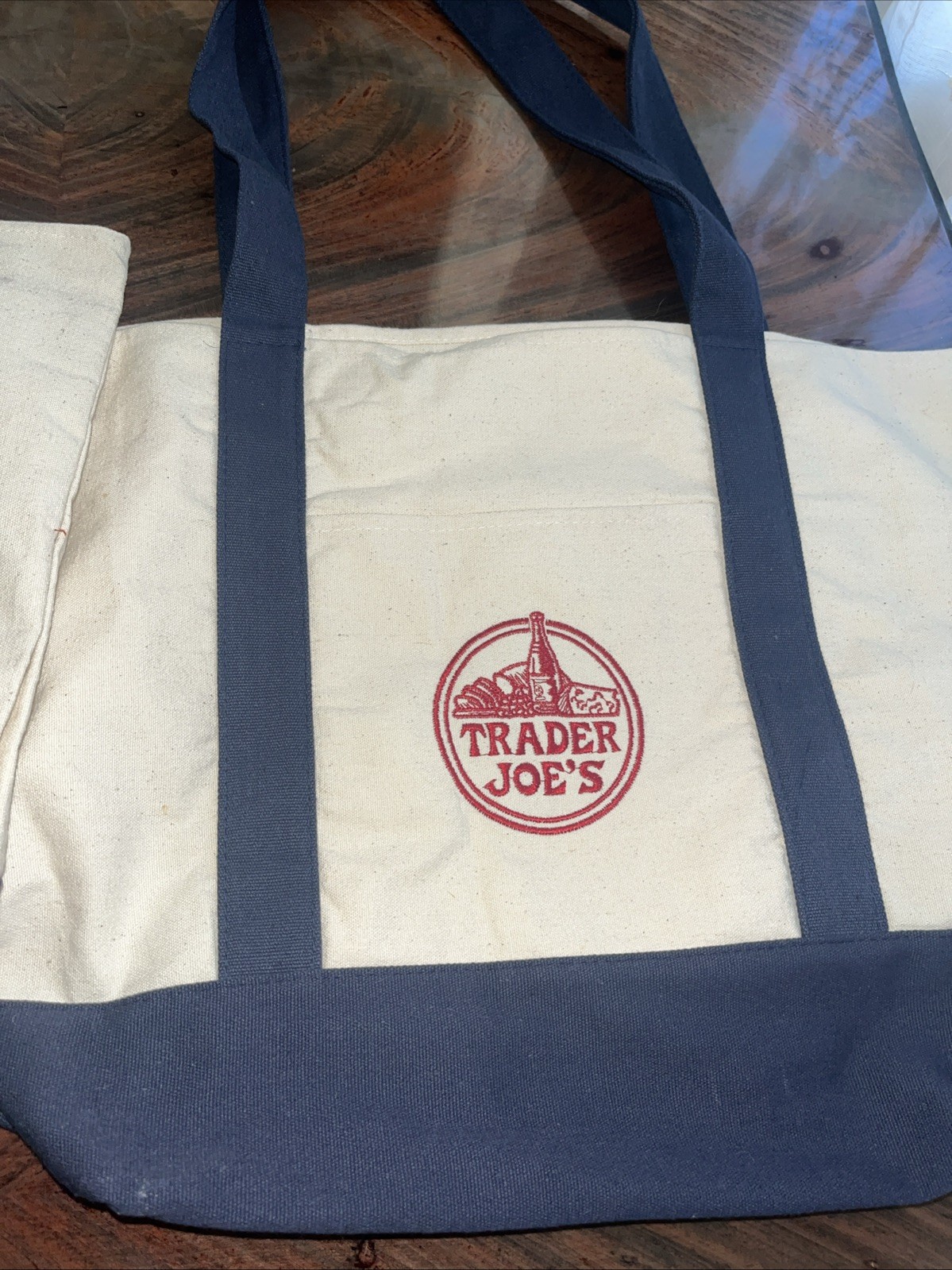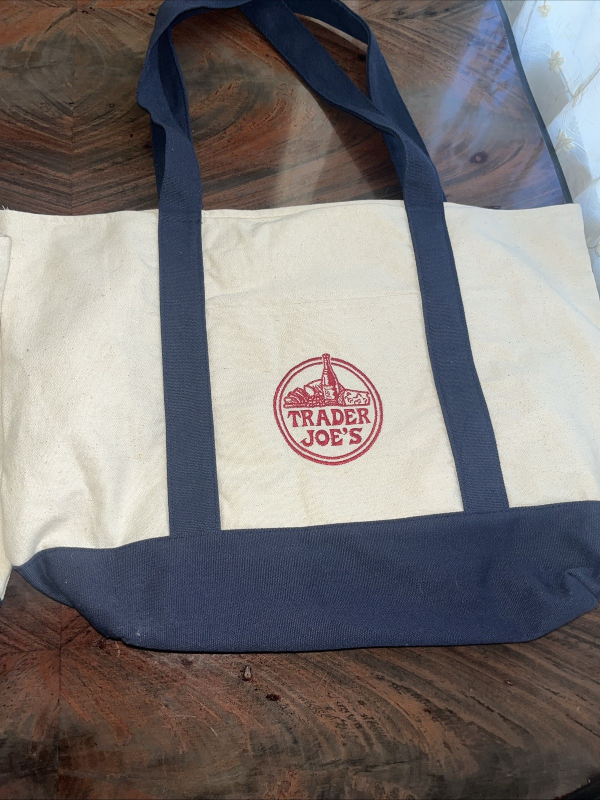 Trader Joe's Reusable Canvas Large Tote Bag Heavy Cotton Blue White