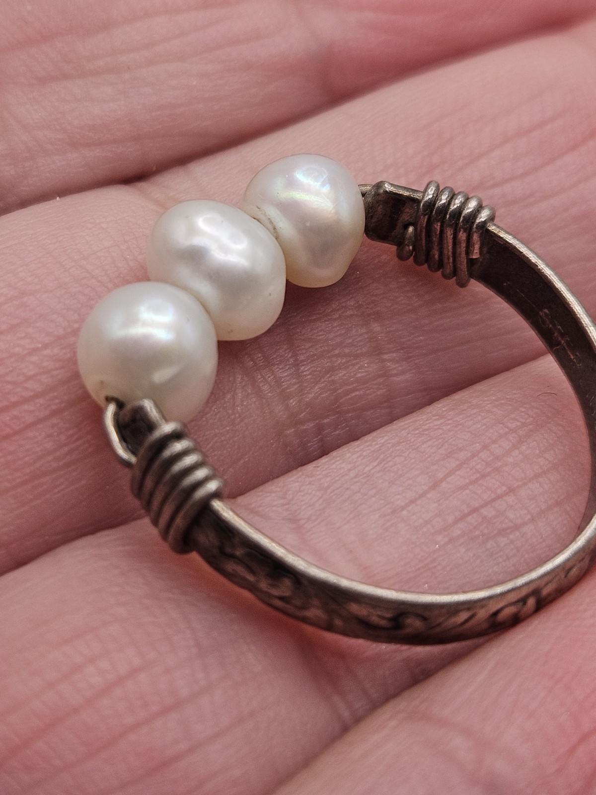 Vintage Artisan Sterling Silver White Freshwater Pearl Band Ring Size 7