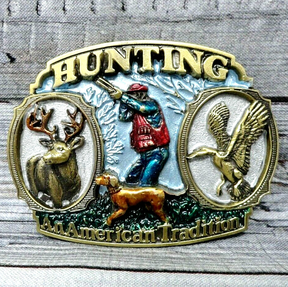 Hunting Belt Buckle Deer Duck Bird Dog Sportsman Enameled Vtg 80s TGABC .CVB309