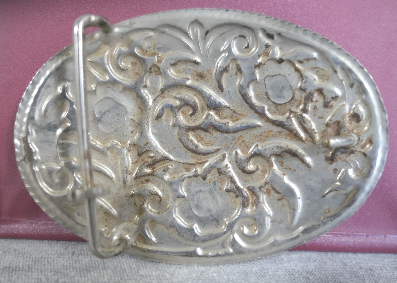 как выглядит Vintage Silver Metal Steel Western Cowboy Flowers Leaves Engraved Belt Buckle фото