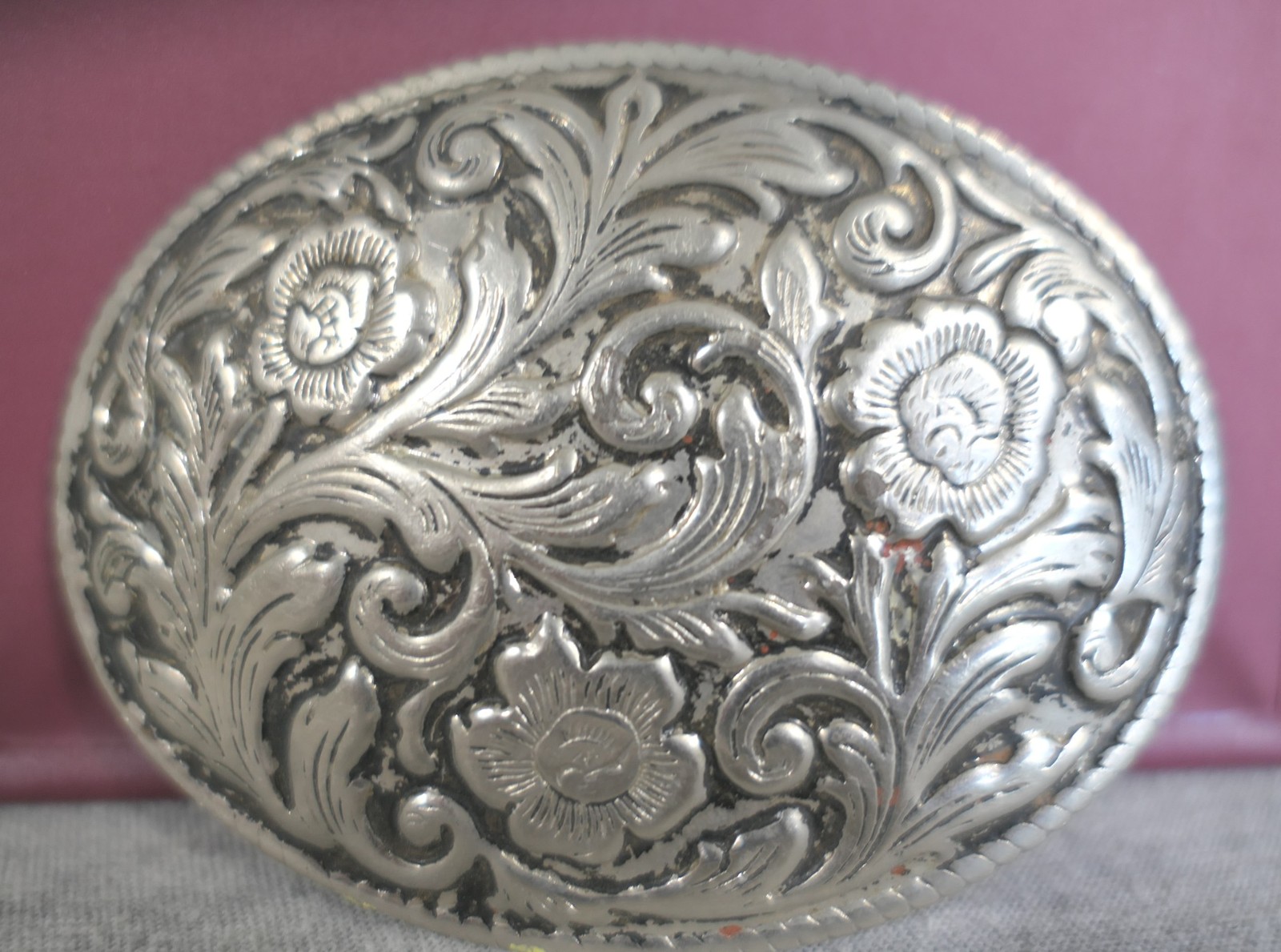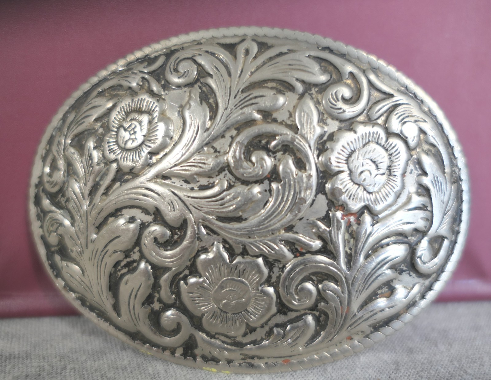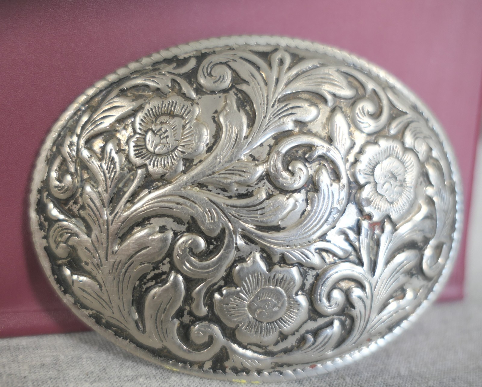 Vintage Silver Metal Steel Western Cowboy Flowers Leaves Engraved Belt Buckle