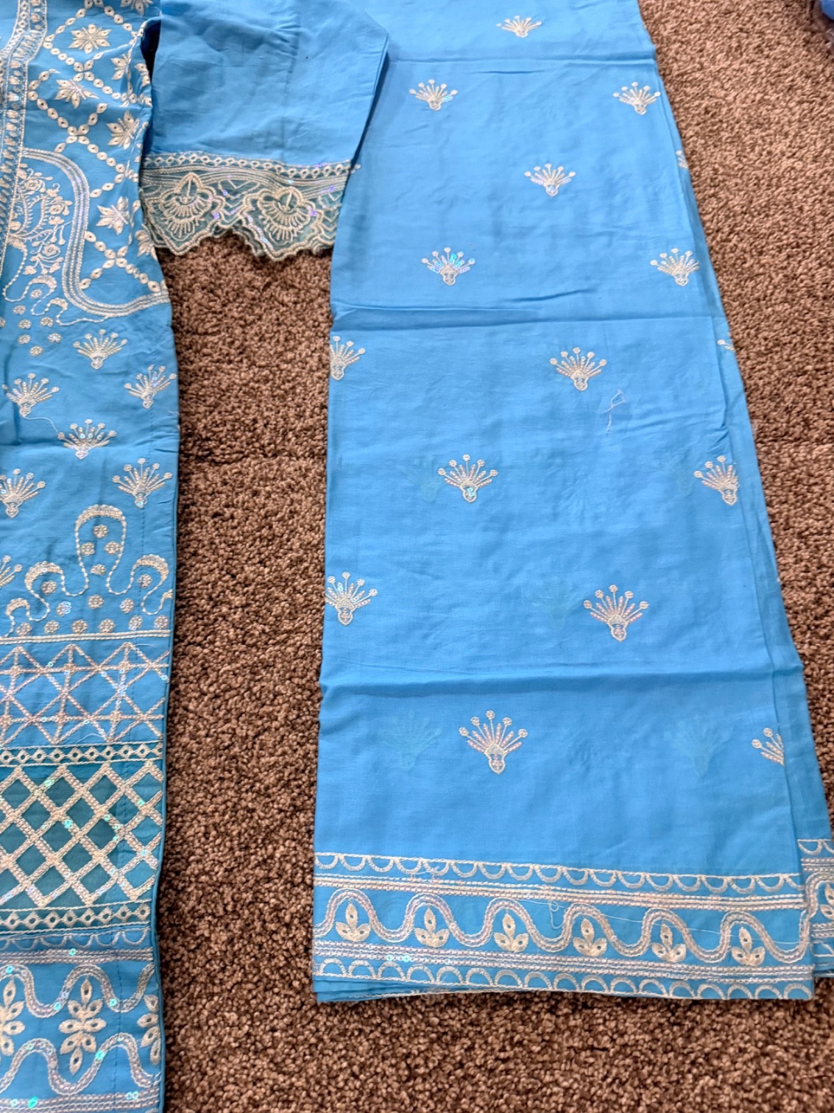Women s 3pc Embroidered Salwar Kameez Suit Tunic Pants Dupatta BlueWhite Set M