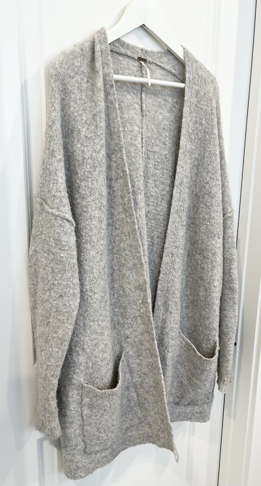 Free People Open Knit Wool Cardigan Sweater Pockets Light Gray Boho Women s M