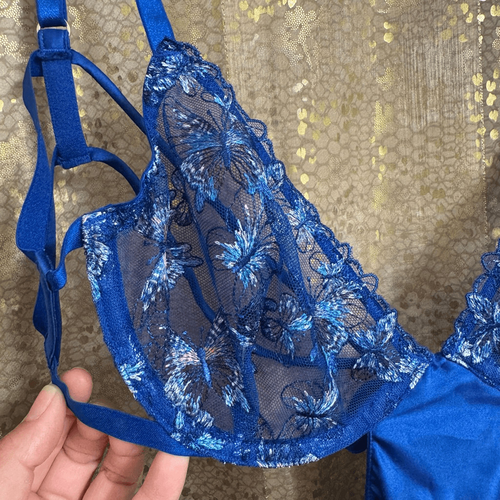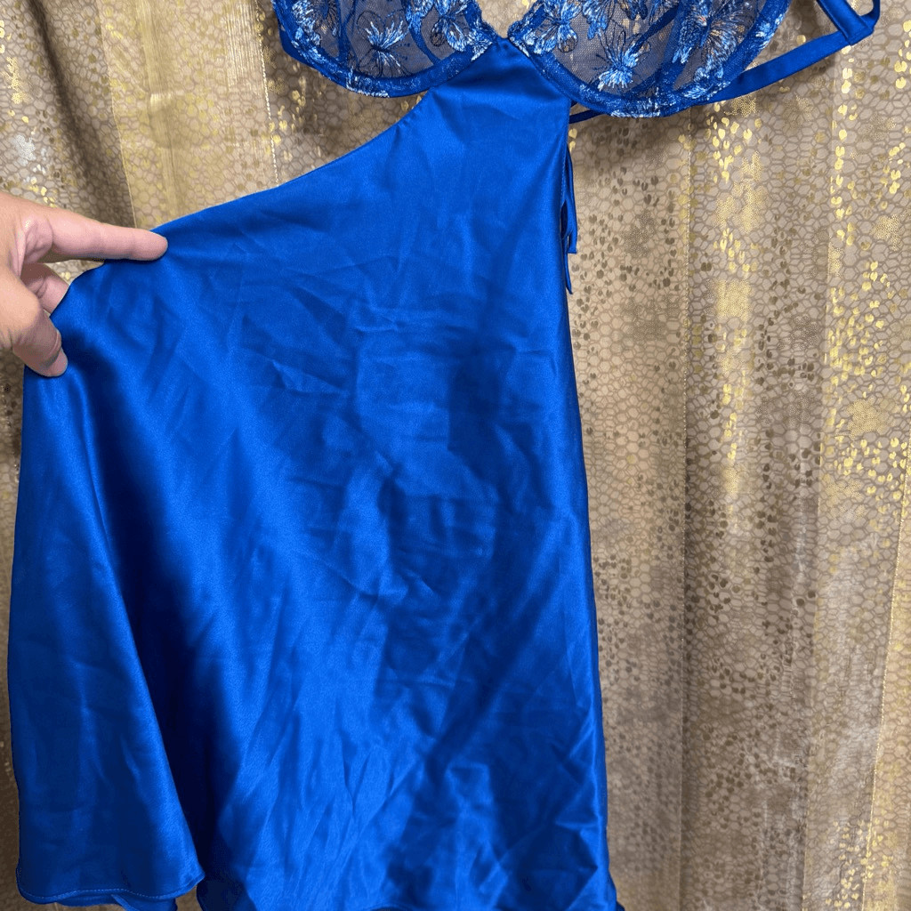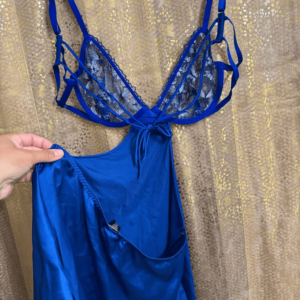 как выглядит Victorias Secret Royal Blue Lace Butterfly Low Cut Demi Satin Slip Medium NWT фото
