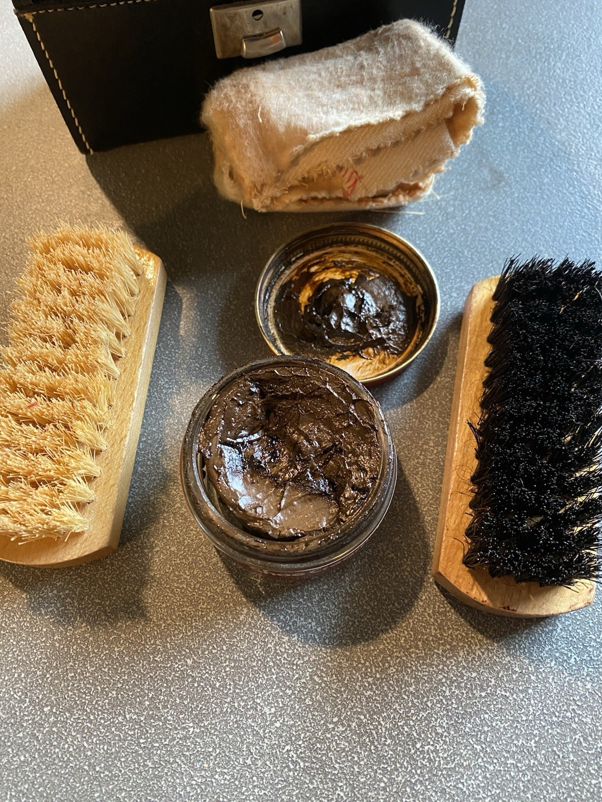как выглядит Vintage Shoe Shine Travel Kit Genuine Leather Brush and Cloth фото