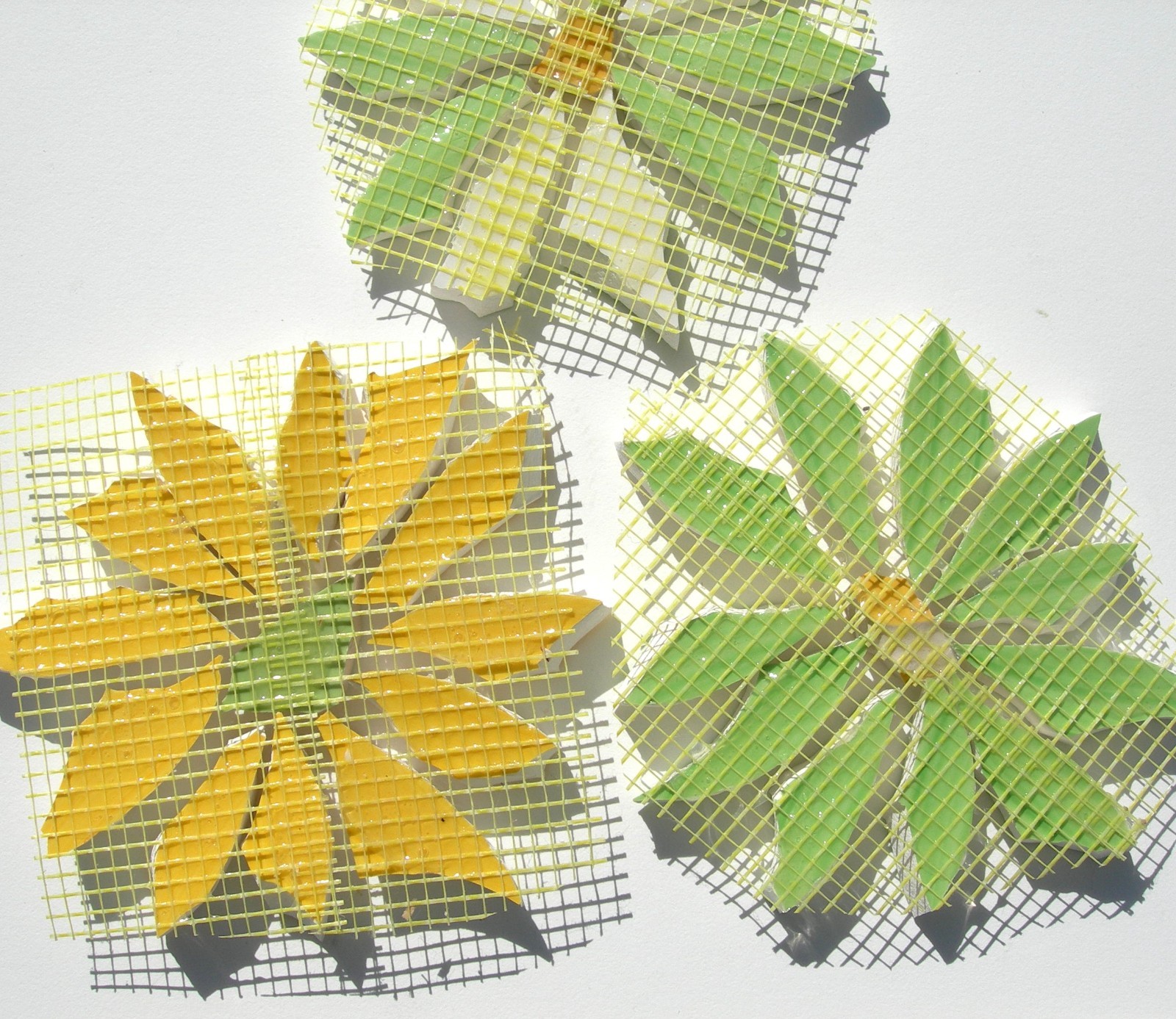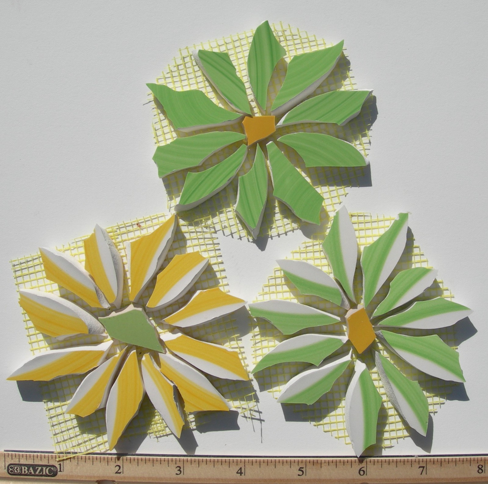 3 Large Yellow, Green Daisy Mosaic Tiles Made of Broken China Plates